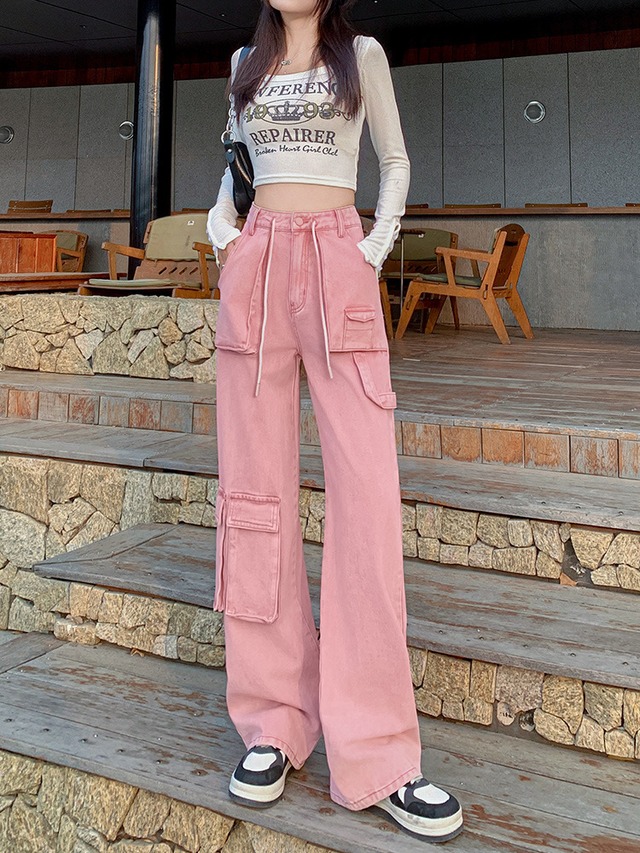 ピンク ワイドデニムパンツ ハイウエスト ストレート 工具風デザイン ルーズシルエット 小柄さん対応 ギャル ストリート レディース