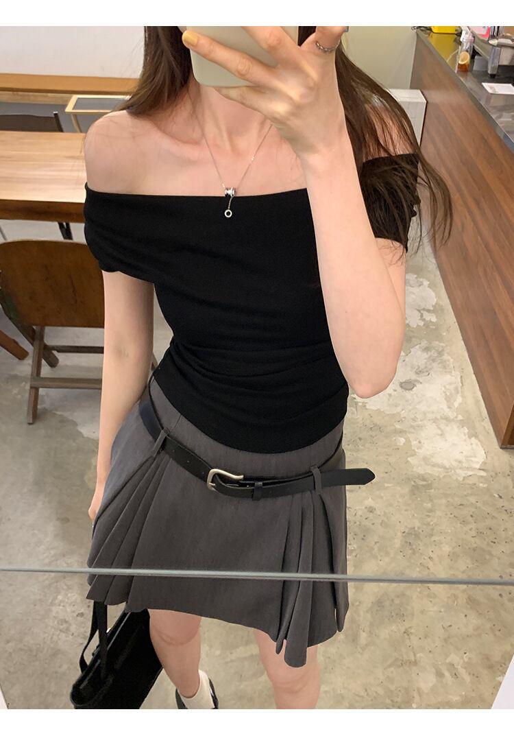 ショート丈ドレープTシャツ|肩見せ×タイトで盛れるオフショルトップス ピンク