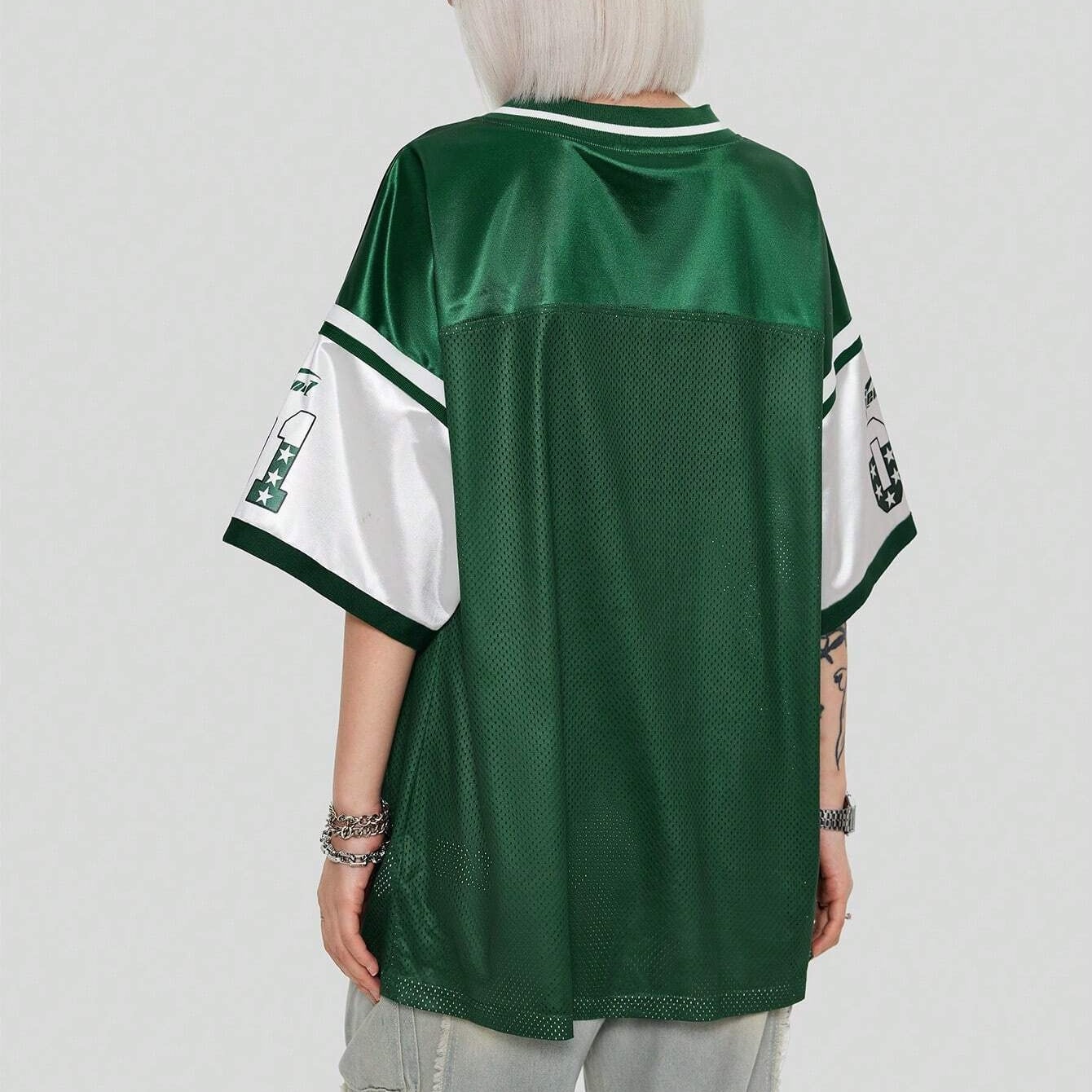 【Y2Kスポーティ】メッシュ風フットボールTシャツ|オーバーサイズ ゲームシャツ風 レディース ユニフォームトップス