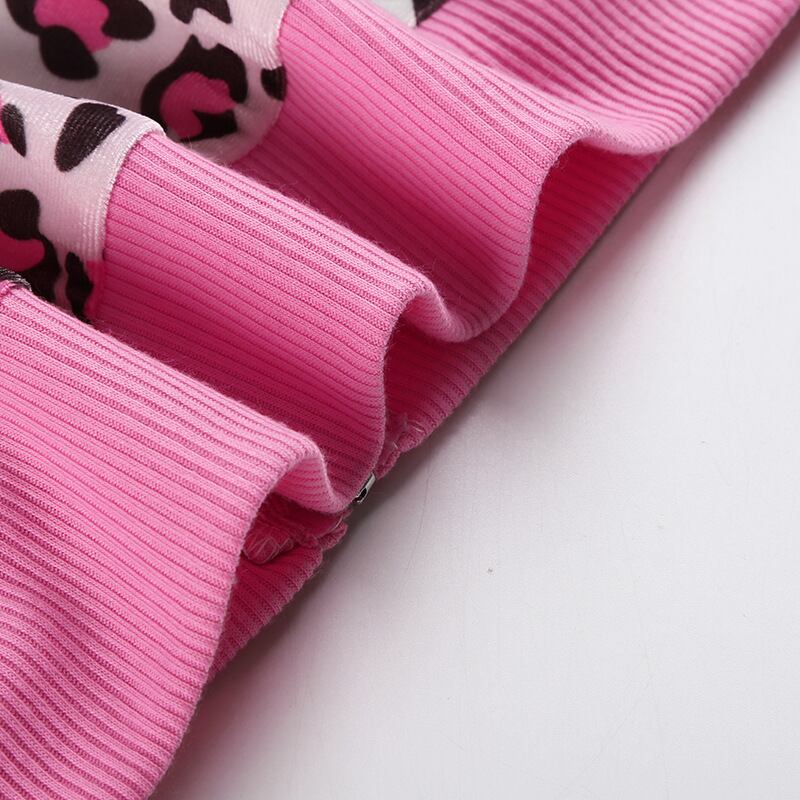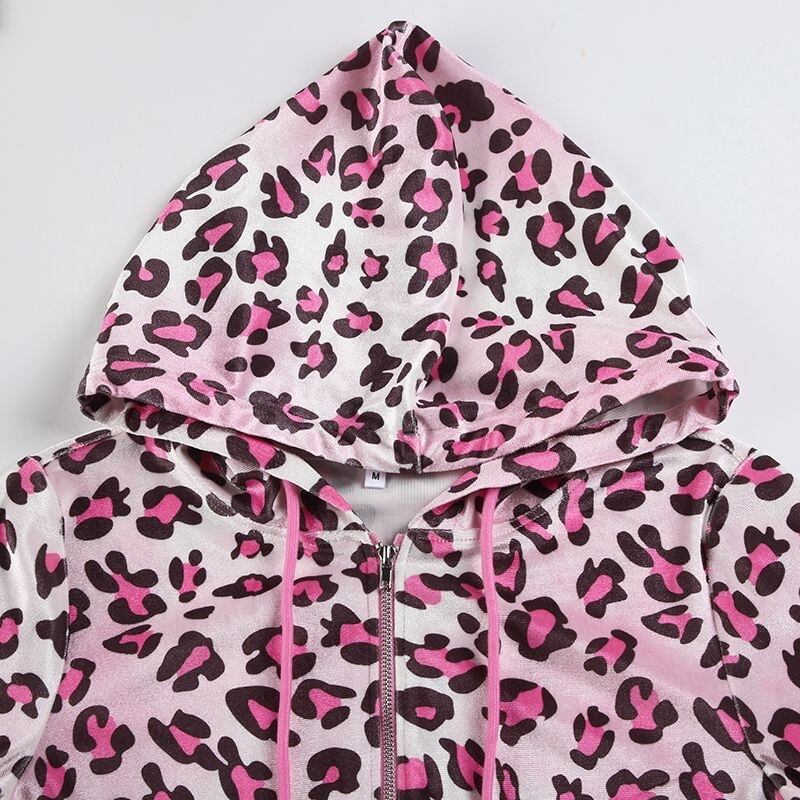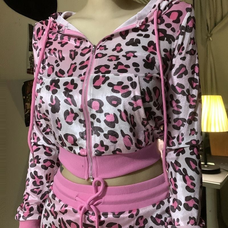 ピンクレオパード柄 韓国ベルベット セットアップ(クロップドパーカー+ミニスカ)秋冬ストリート ギャルコーデ 【即完売級】