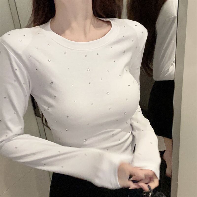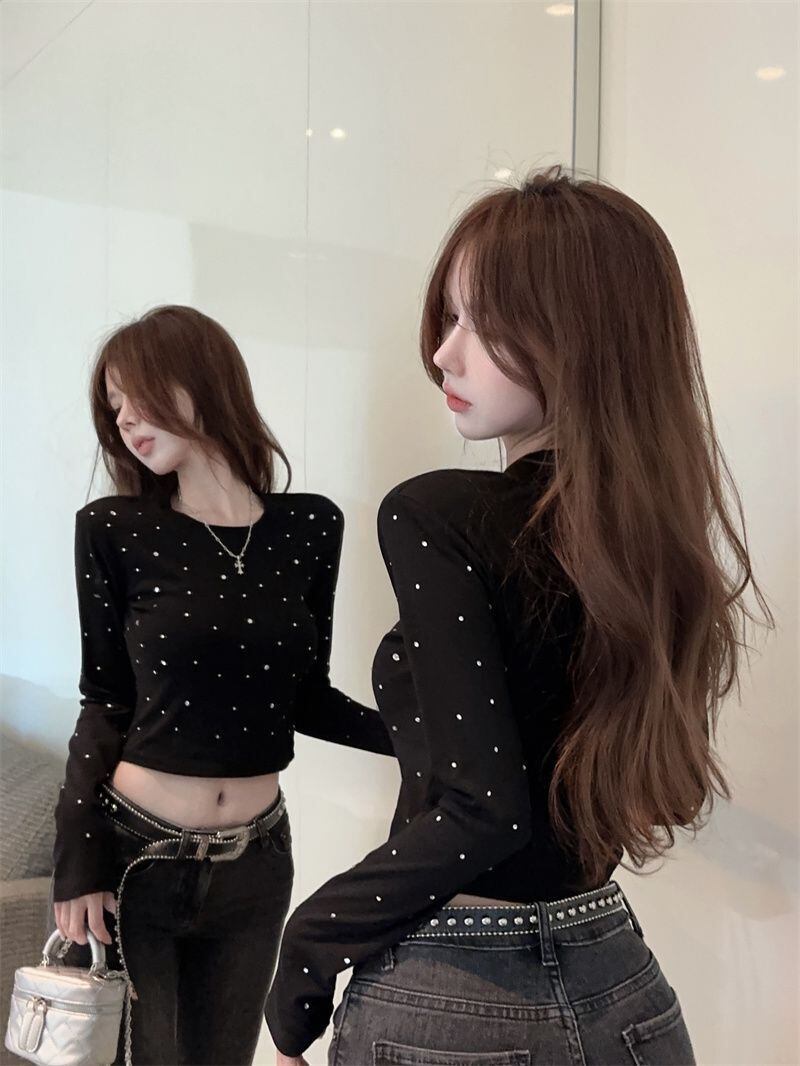 美ラインストーンショート丈Tシャツ 長袖 レディース トレンド 秋冬 韓国ファッション ギャル