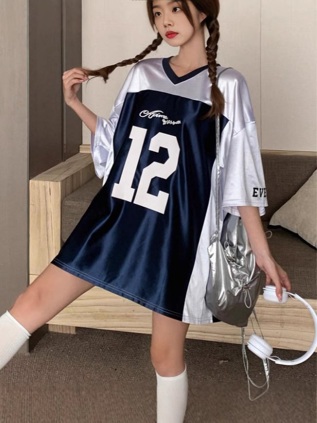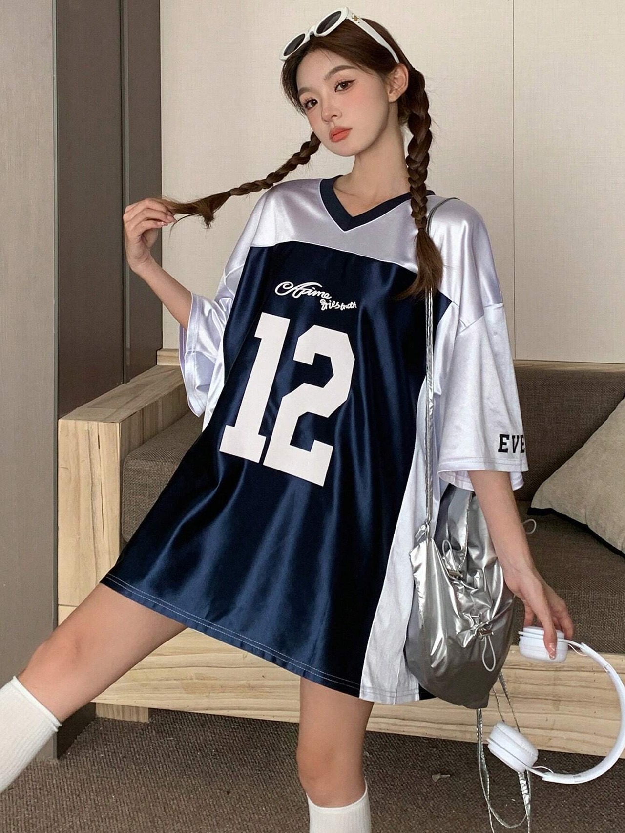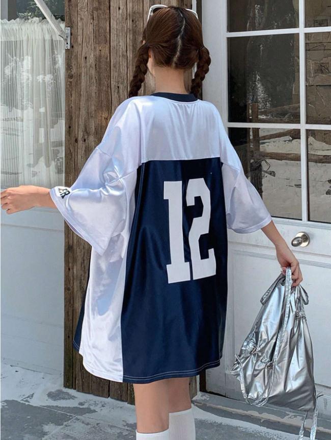 スポーツTシャツ 光沢サテン風 Vネック 半袖Tシャツ レディース|ゆったりオーバーサイズ 英字ロゴプリント スポーツMIX 韓国ストリート 夏トップス
