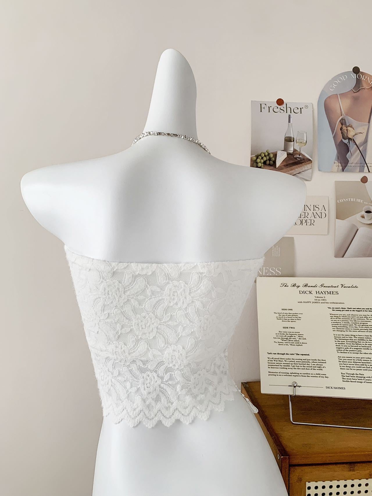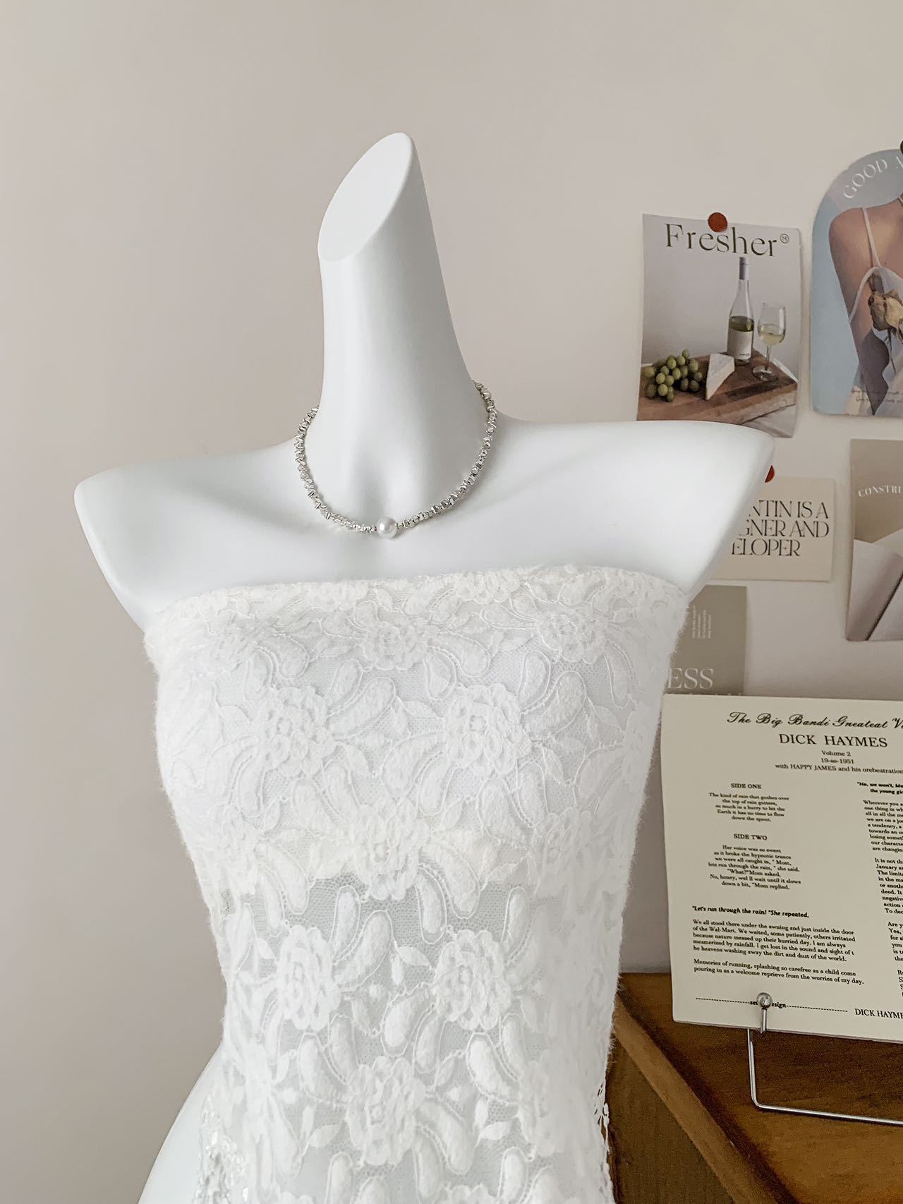 肩紐なしのデザインでデコルテをすっきり魅せつつ、程よいフィット感でウエストラインを強調。