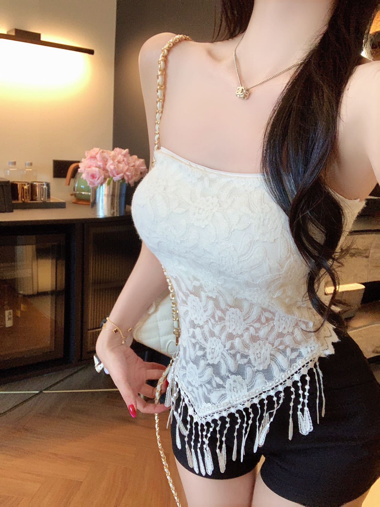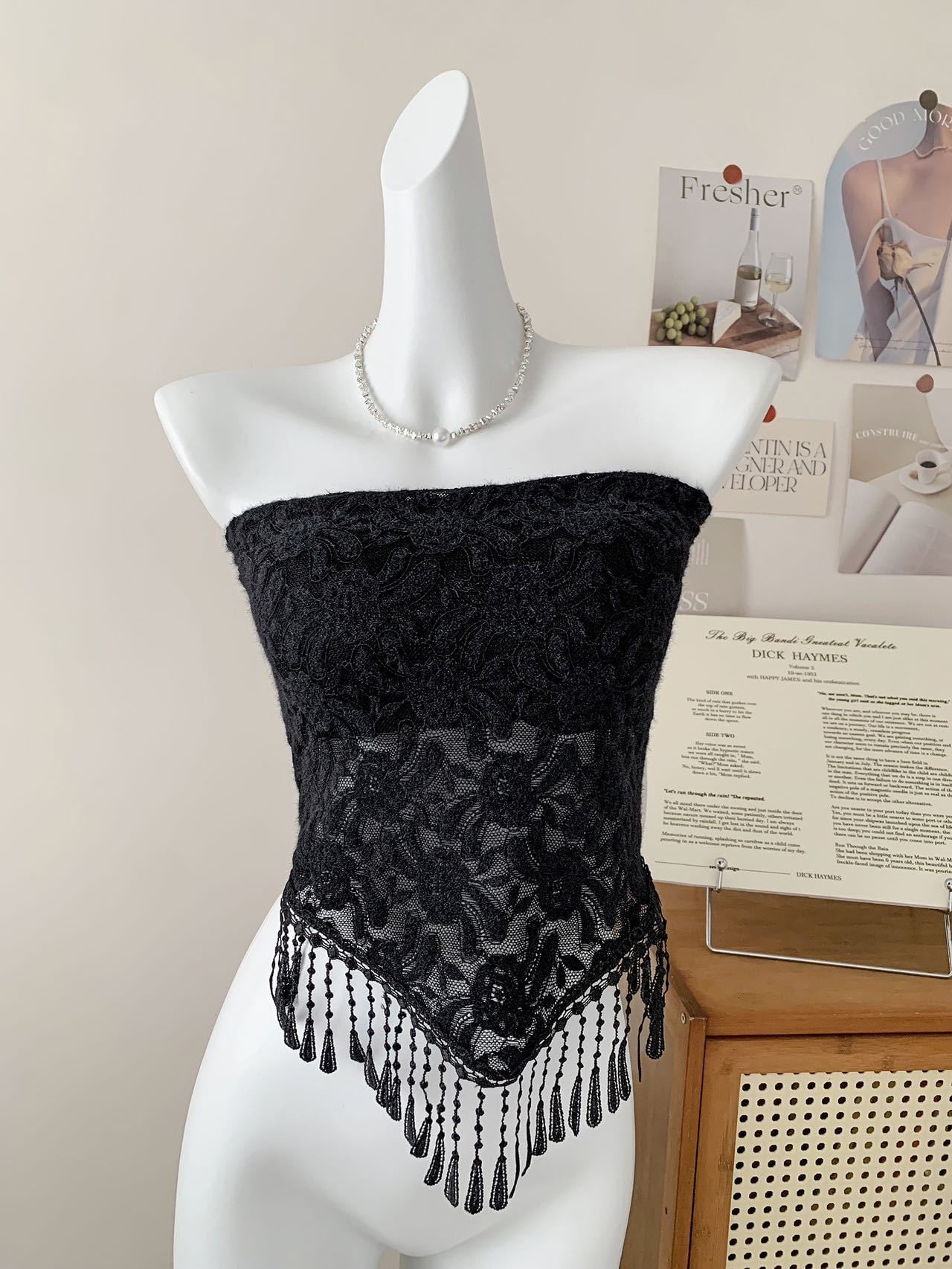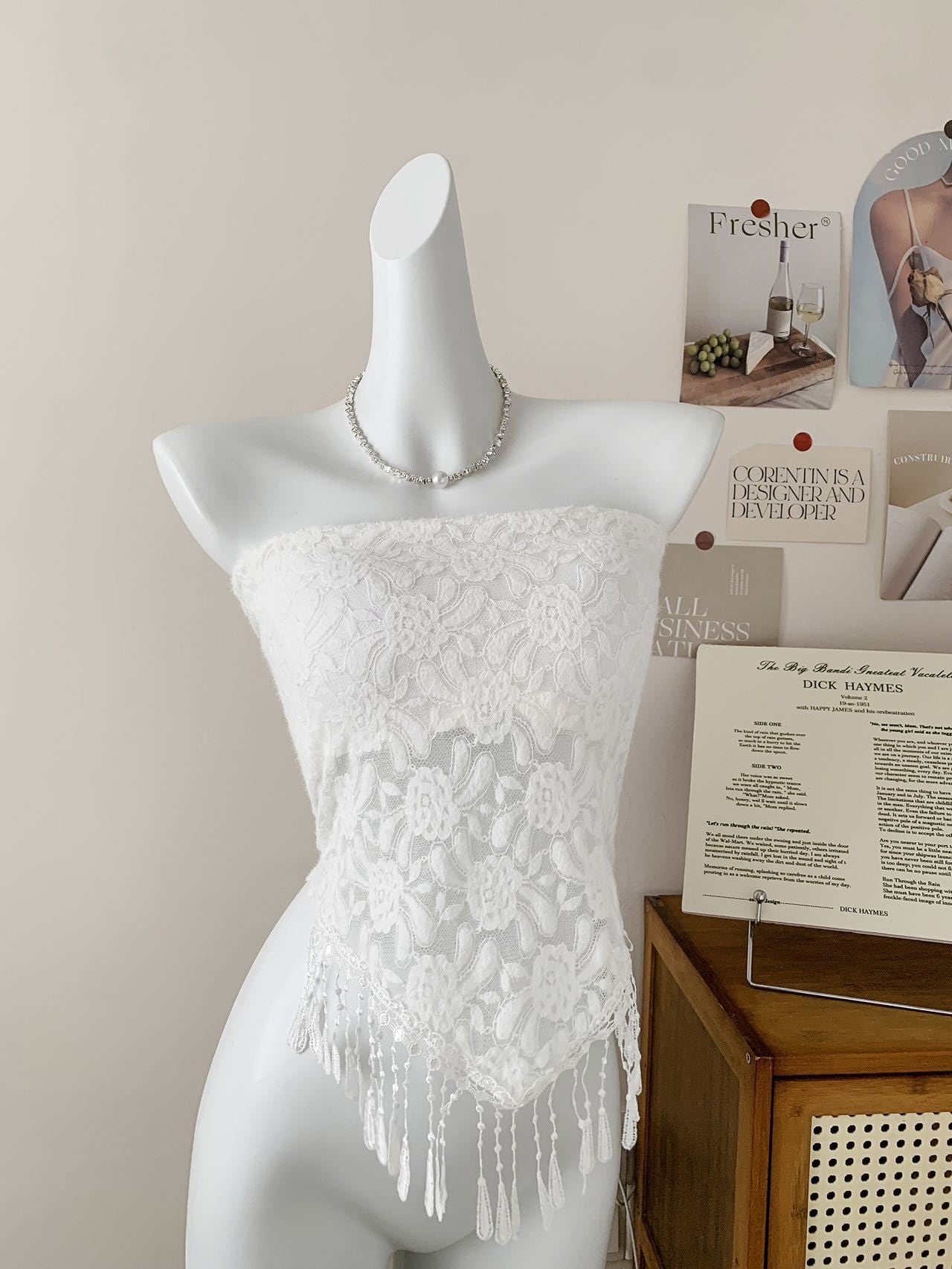 レースフリンジ チューブトップ キャミソール|大人可愛い 上品タイトトップス ノンストラップ