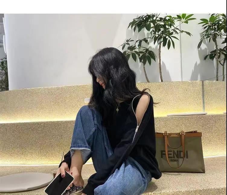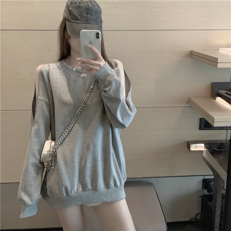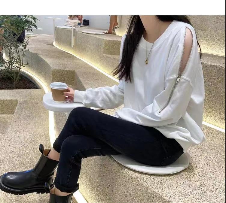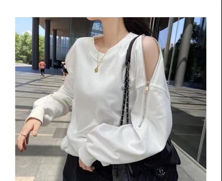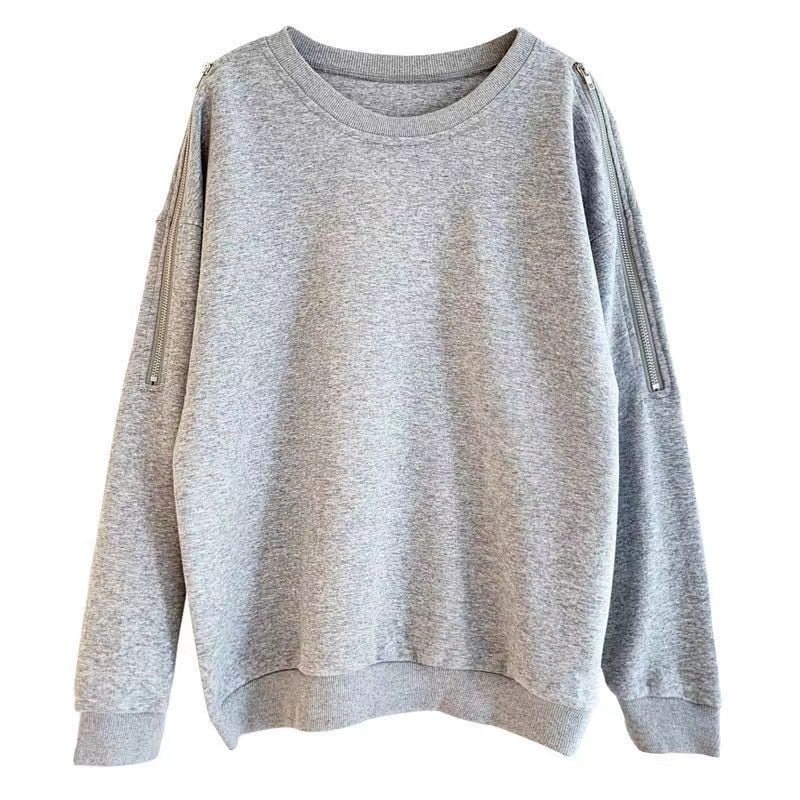 秋冬 肩見せジップデザイン 長袖スウェット|ゆったりシルエット 韓国風カジュアルトップス