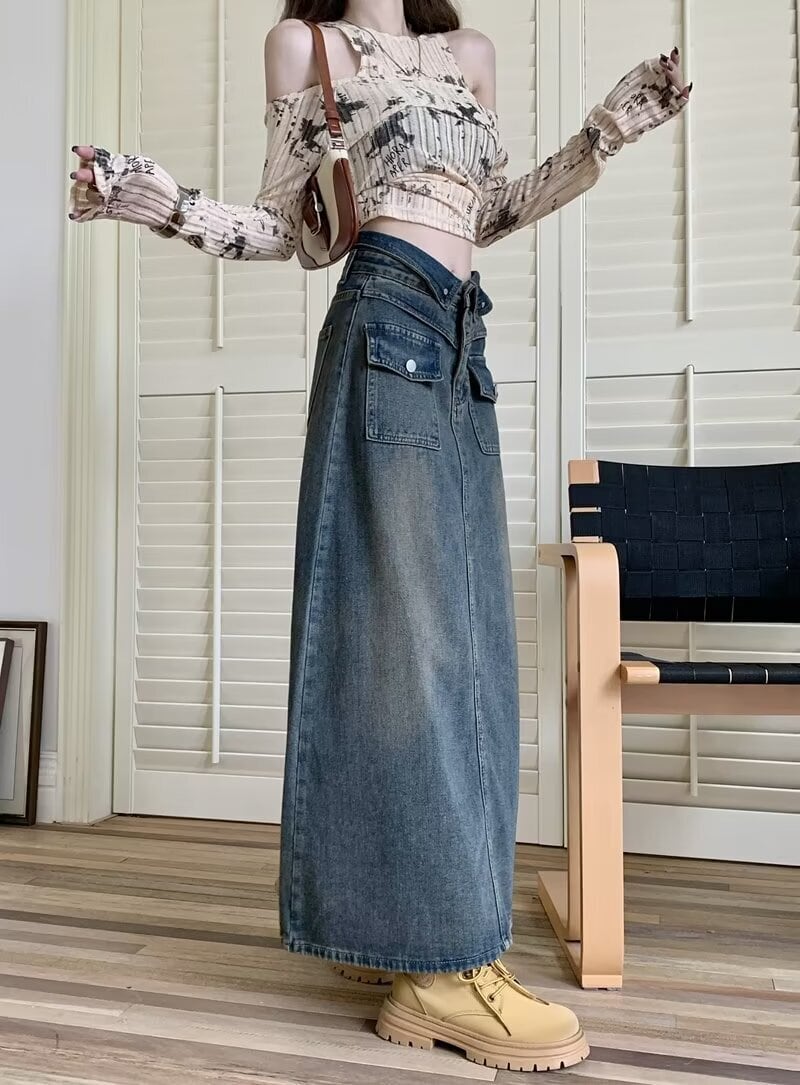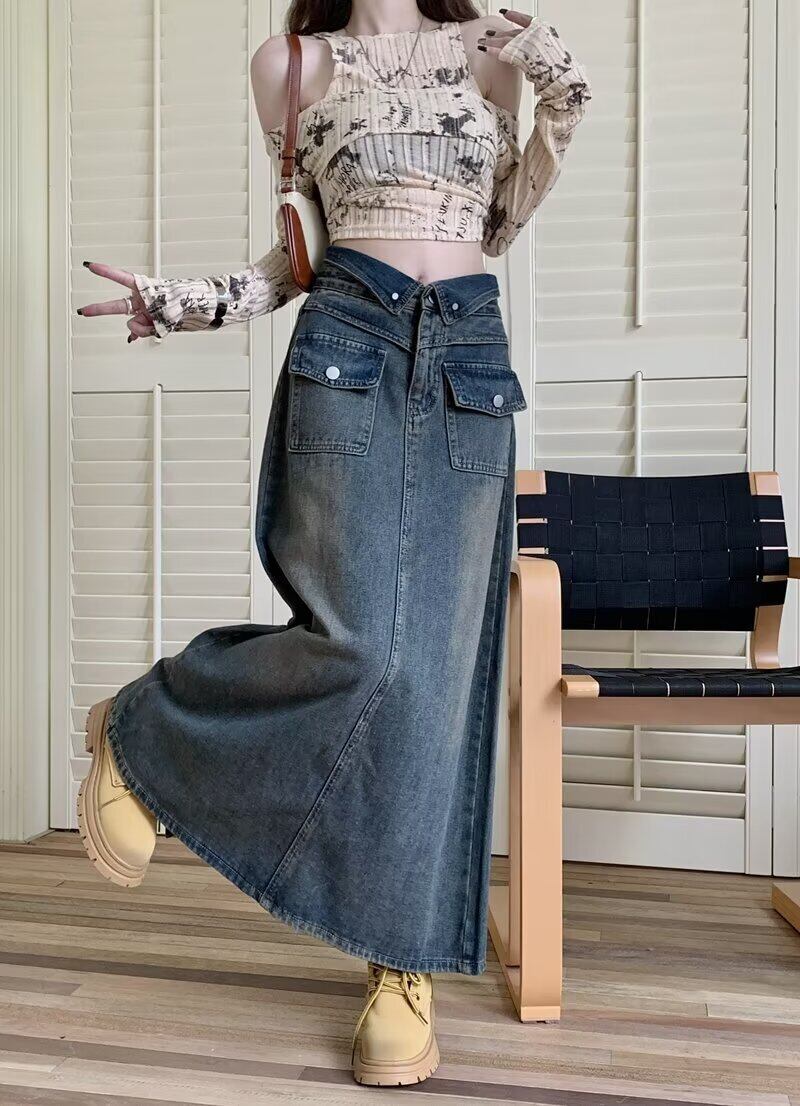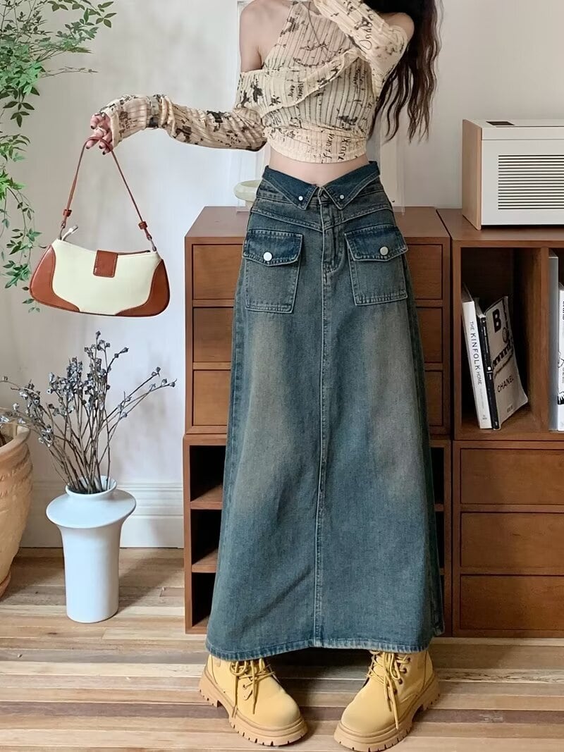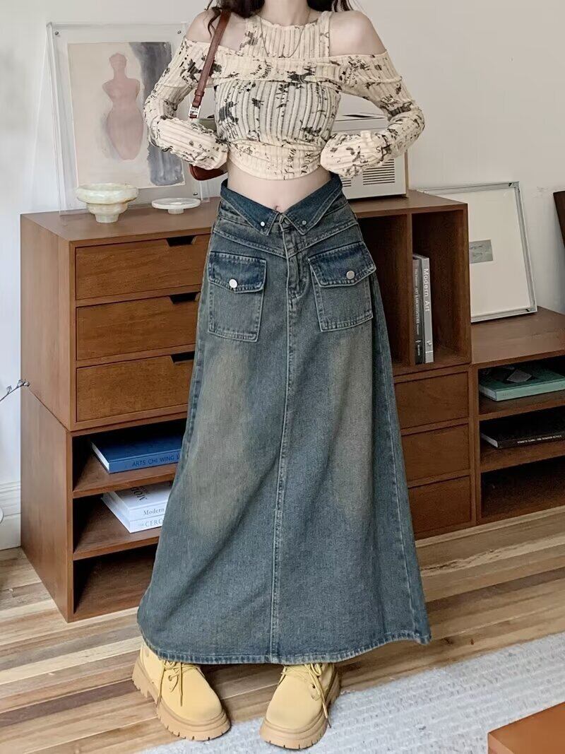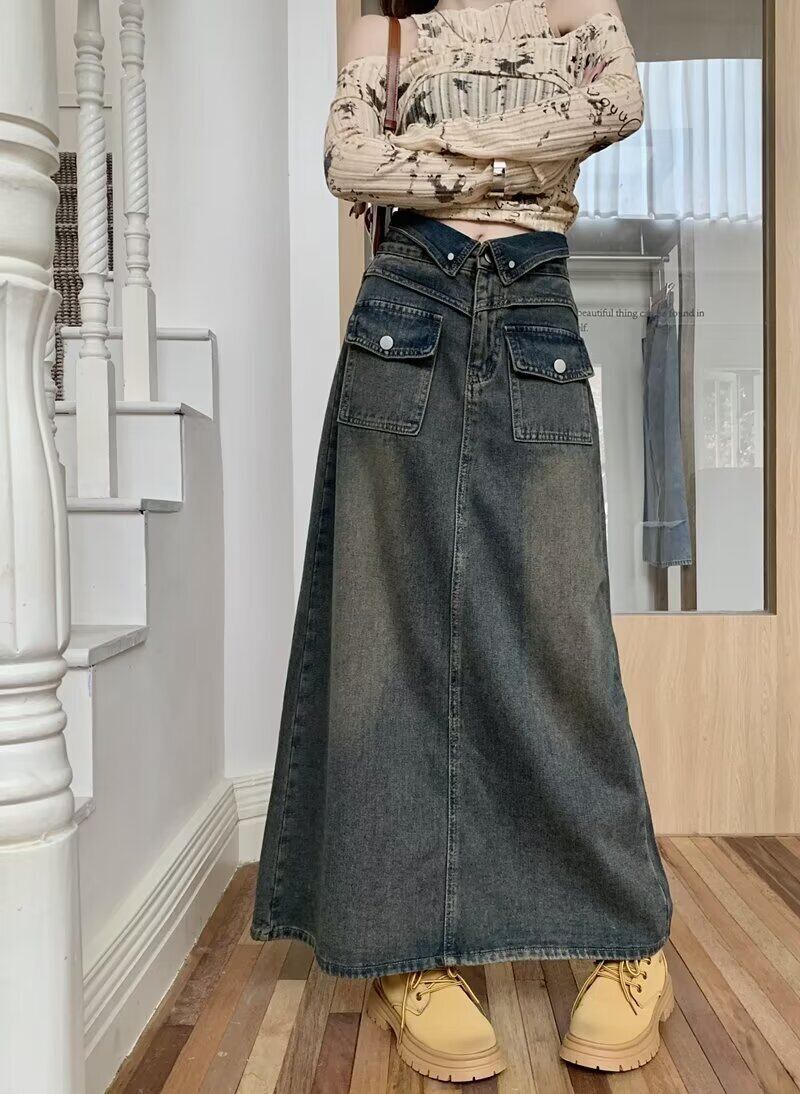 折り返しウエストデニムマキシスカート レディース 秋新作 Aライン バックスリット 脚長映え