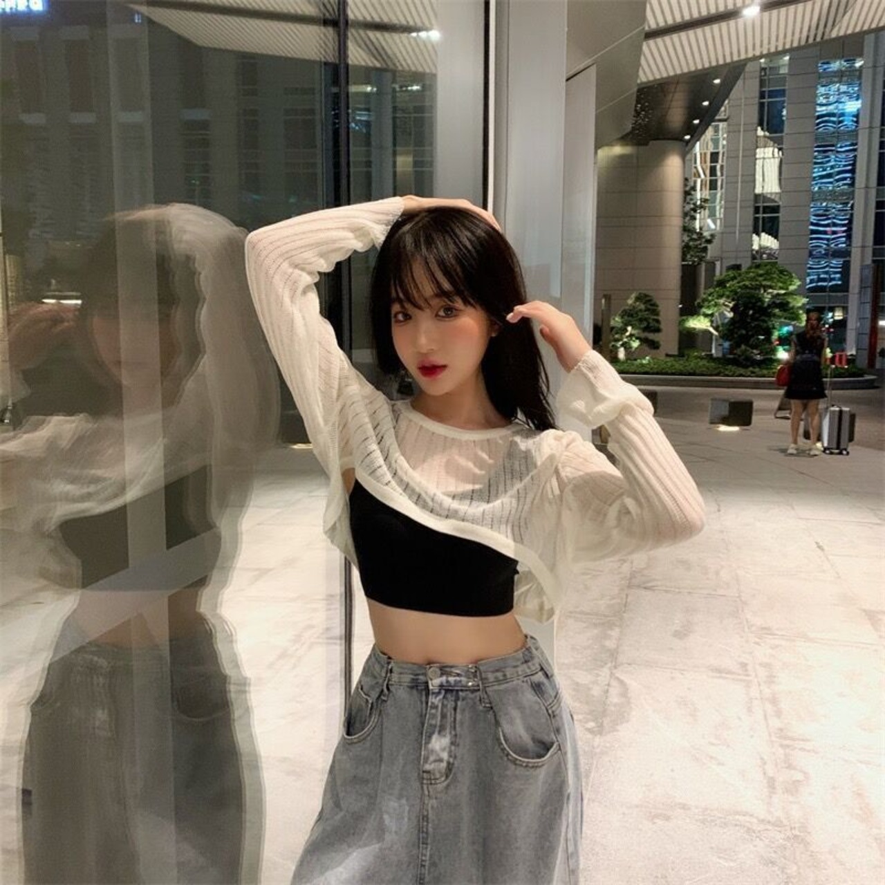 シースルーニット ブラック レディース クロップド丈 ニット 薄手 長袖 透け感 カーディガン風 Y2K ギャル系 セクシー 黒 白 S〜XL