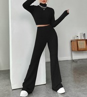 ハイネックニットセットアップ レディース 秋冬 長袖トップス×ワイドパンツ シンプル 大人カジュアル ブラック