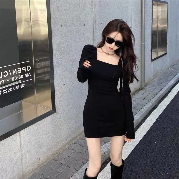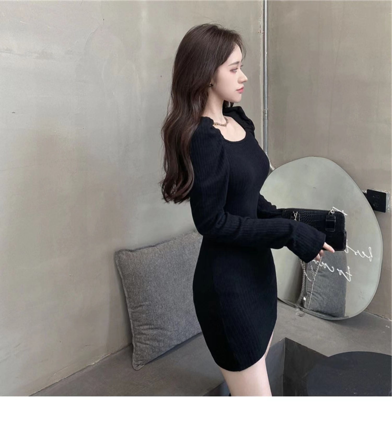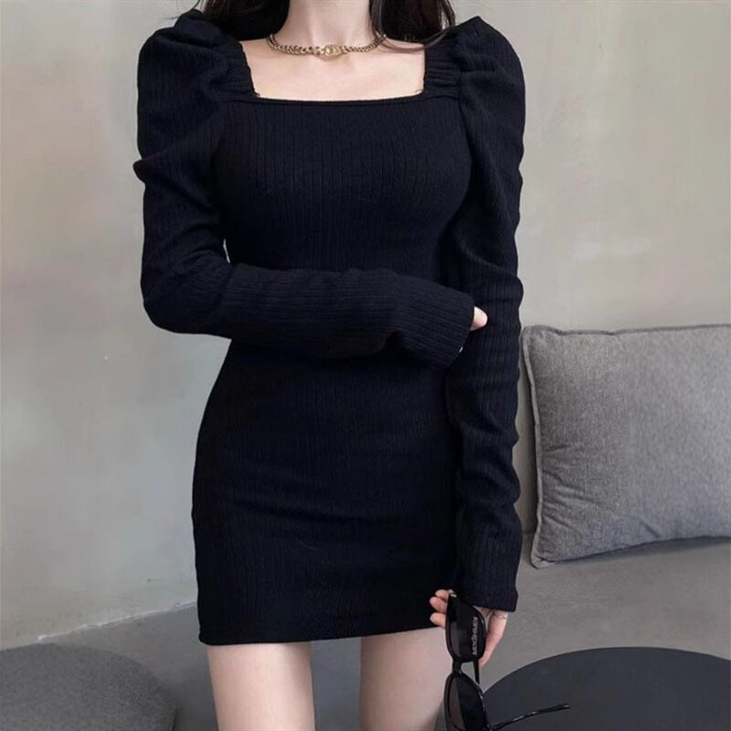 フレンチガール風 ワンピース タイト ミニドレス セクシー 韓国ファッション 秋冬 ボディライン美見せ スクエアネック ショート丈 ブラック