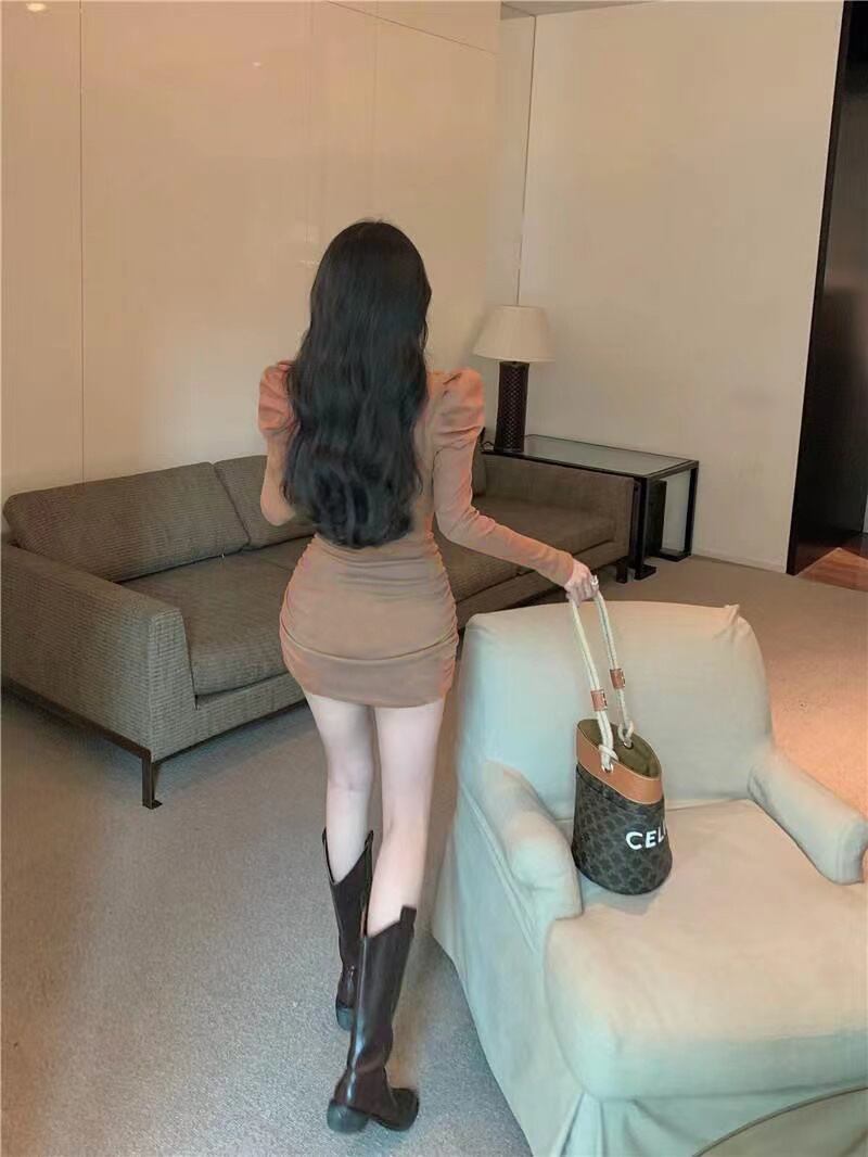 フレンチガール風 ワンピース タイト ミニドレス セクシー 韓国ファッション 秋冬 ボディライン美見せ スクエアネック ショート丈 カーキ