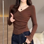 上品で女性らしい雰囲気を演出するVネックリブトップス。伸縮性のあるやわらかな生地で、程よく体にフィットし美しいシルエットを叶えます。ボタンデザインがアクセントになり、1枚でもインナーでも着回しやすい万能アイテム。秋冬の通勤やデイリーコーデ、重ね着にも活躍します。