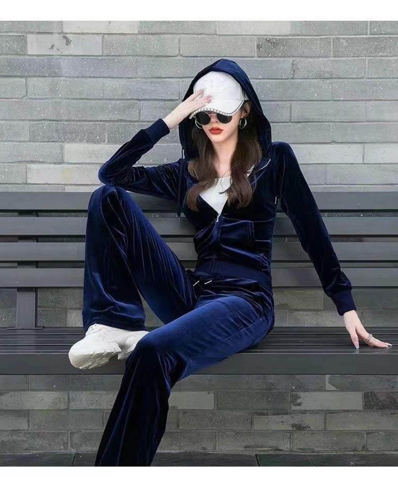 上品な光沢感のあるベロア素材で仕立てた、フーディー×ストレートパンツの2点セット。