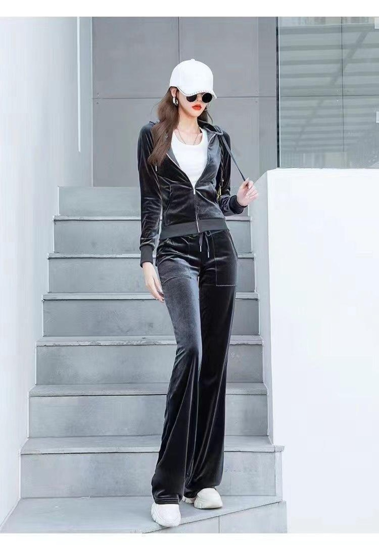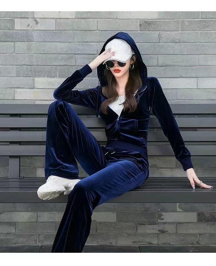 【2025秋新作】ベロアセットアップ レディース スポーティー パーカー×ストレートパンツ 上下セット ジャージ風 おしゃれルームウェア チャコールグレー