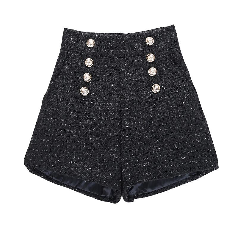 【2025秋新作】ツイード調 ダブルボタン ショートパンツ レディース ハイウエスト ワイドパンツ 脚長効果 BLACK
