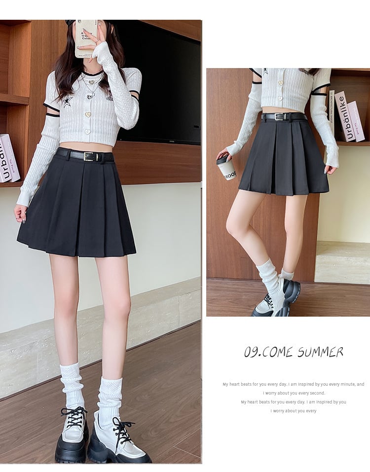 秋新作 ベルト付きプリーツスカート ハイウエストAライン 美脚ミニ丈 スタイルアップ 清楚ギャル ブラック