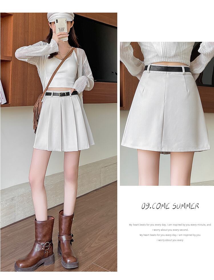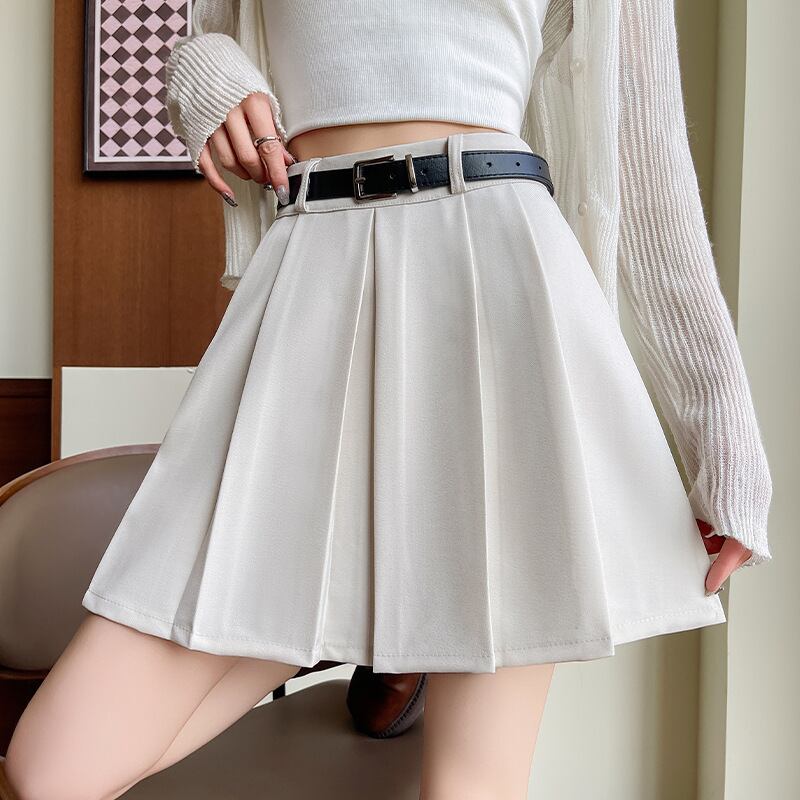 秋新作 ベルト付きプリーツスカート ハイウエストAライン 美脚ミニ丈 スタイルアップ 清楚ギャル オフホワイト