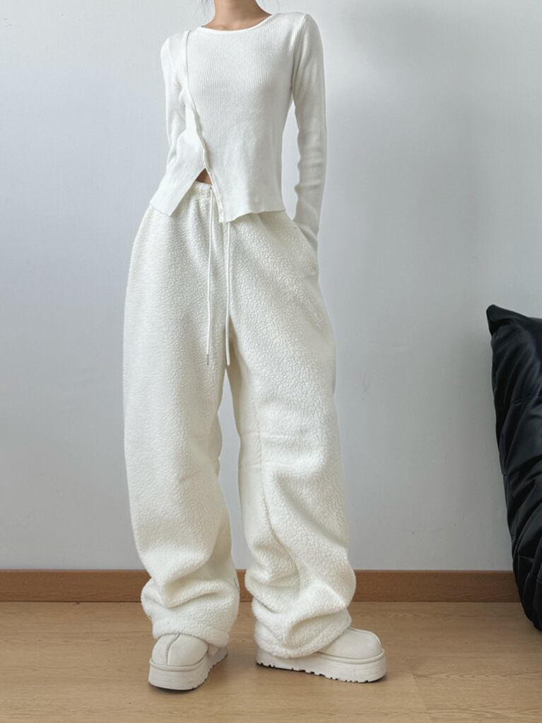 もこもこフリース素材で超あったか、ゆったりシルエットなのに脚長見えが叶うワイドパンツ。
