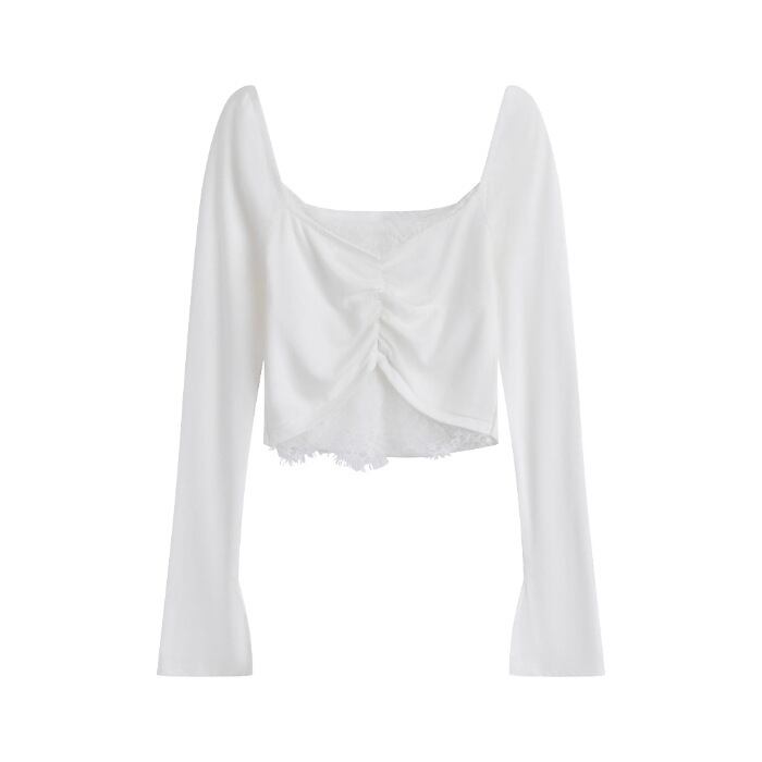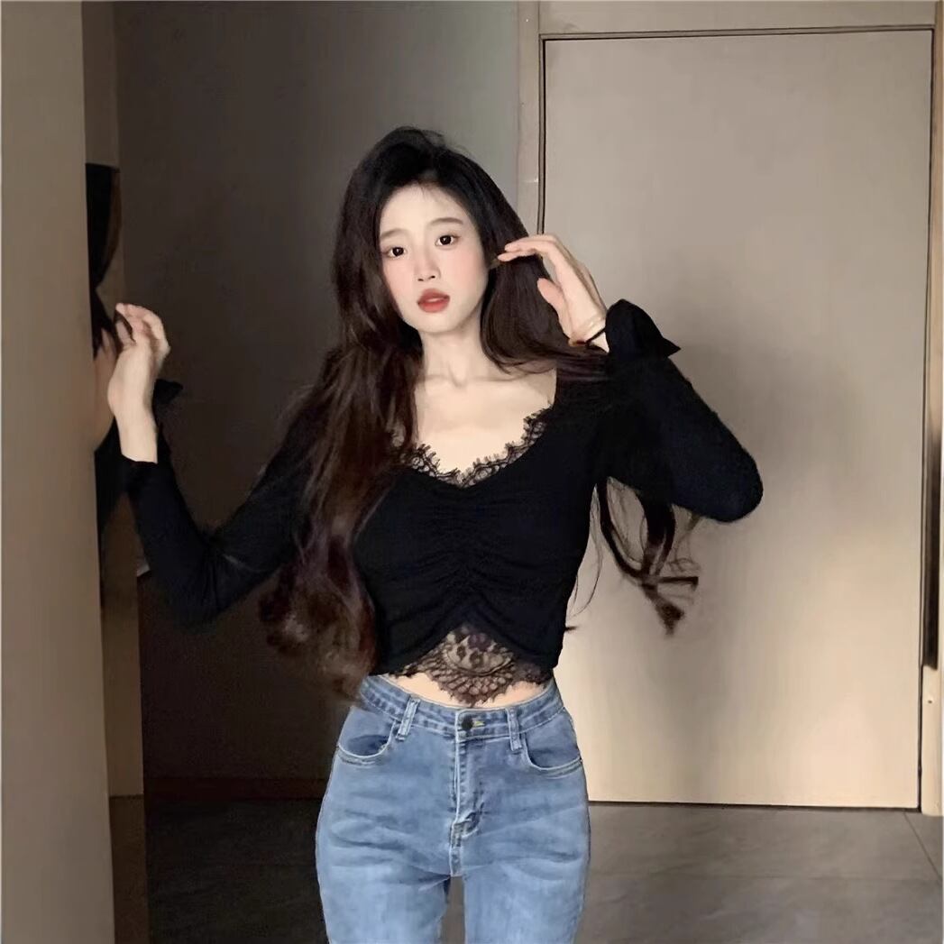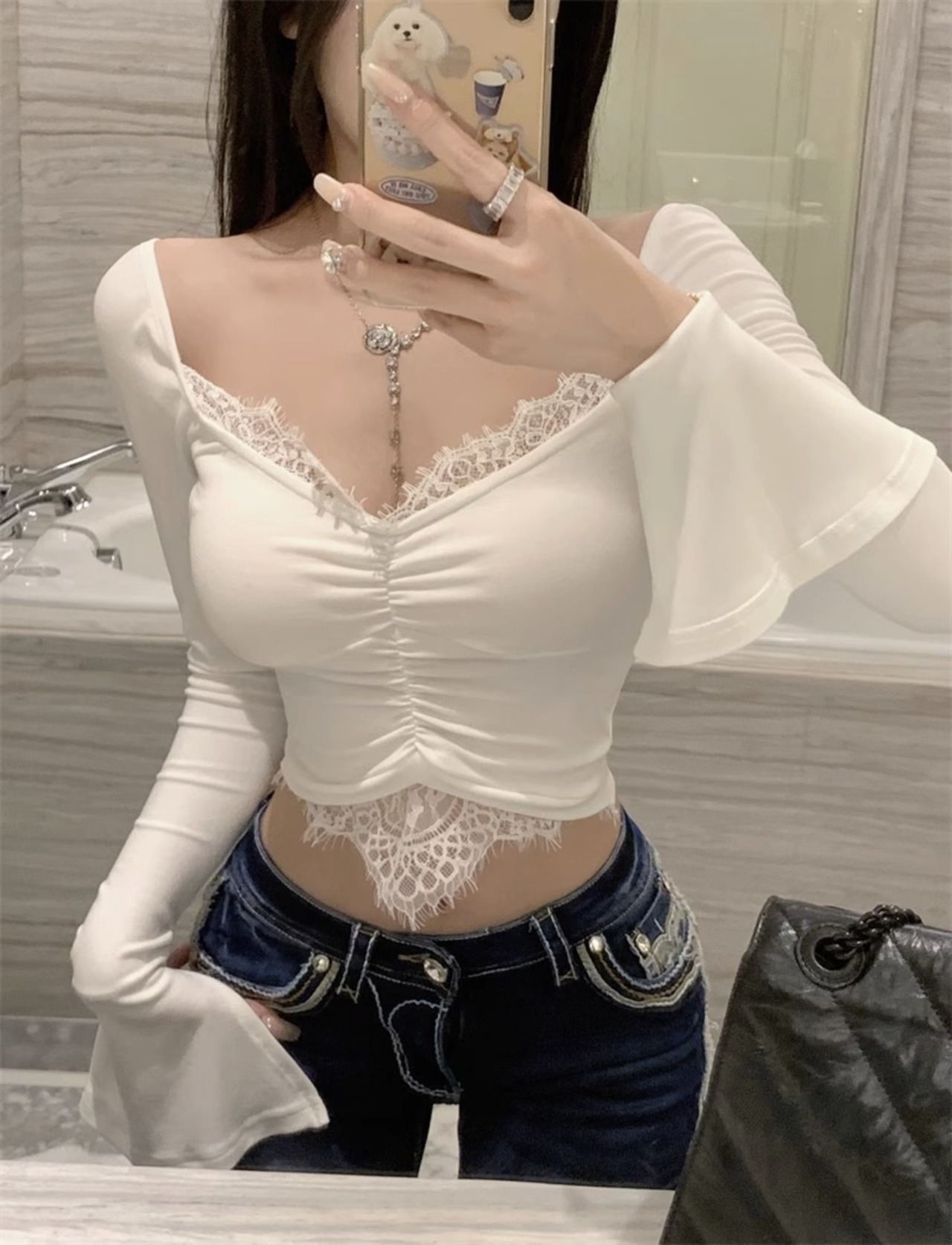 レースVネック 長袖ショートトップス 秋コーデ レディース ホワイト シンプル セクシー