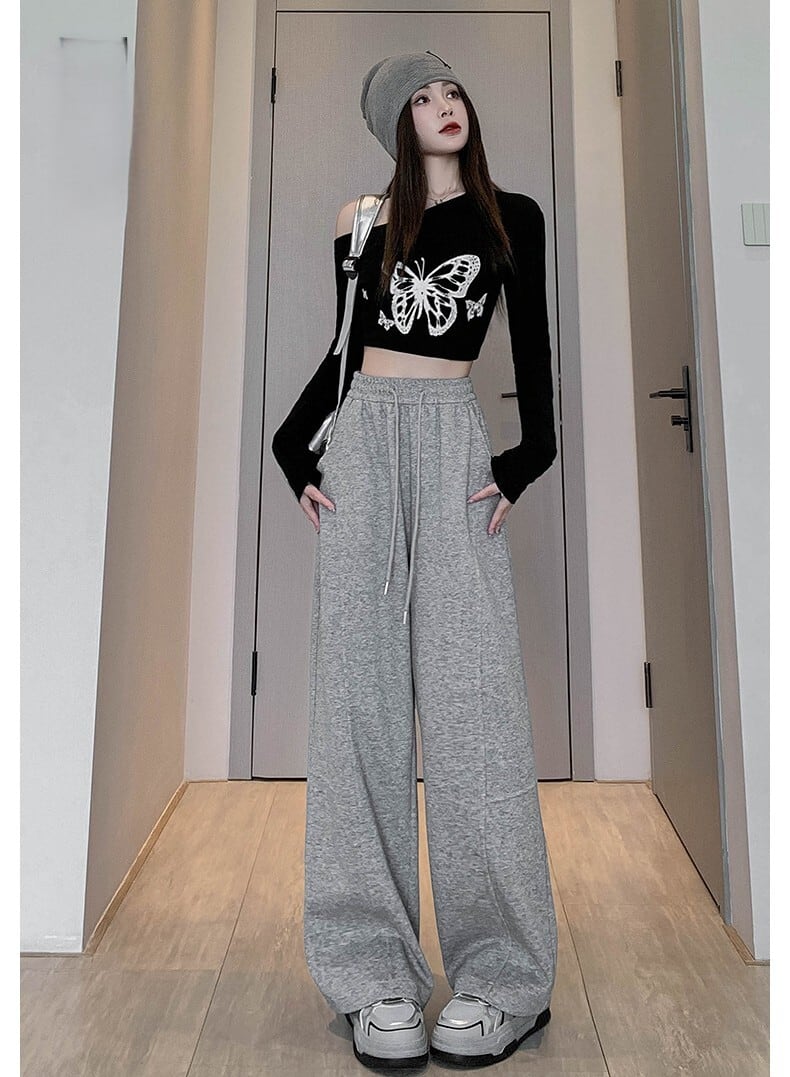 ワイドレッグパンツ レディース ハイウエスト ストレート 秋 ゆったり スウェットパンツ ロング丈 カジュアル ボトムス ホワイトグレー
