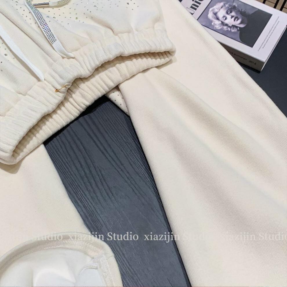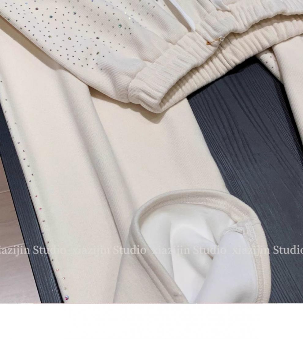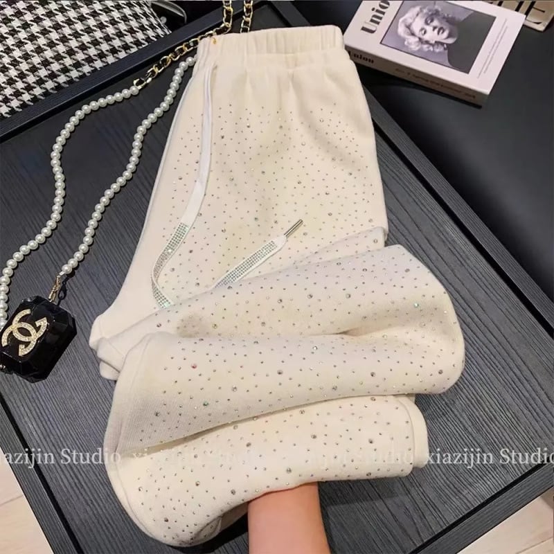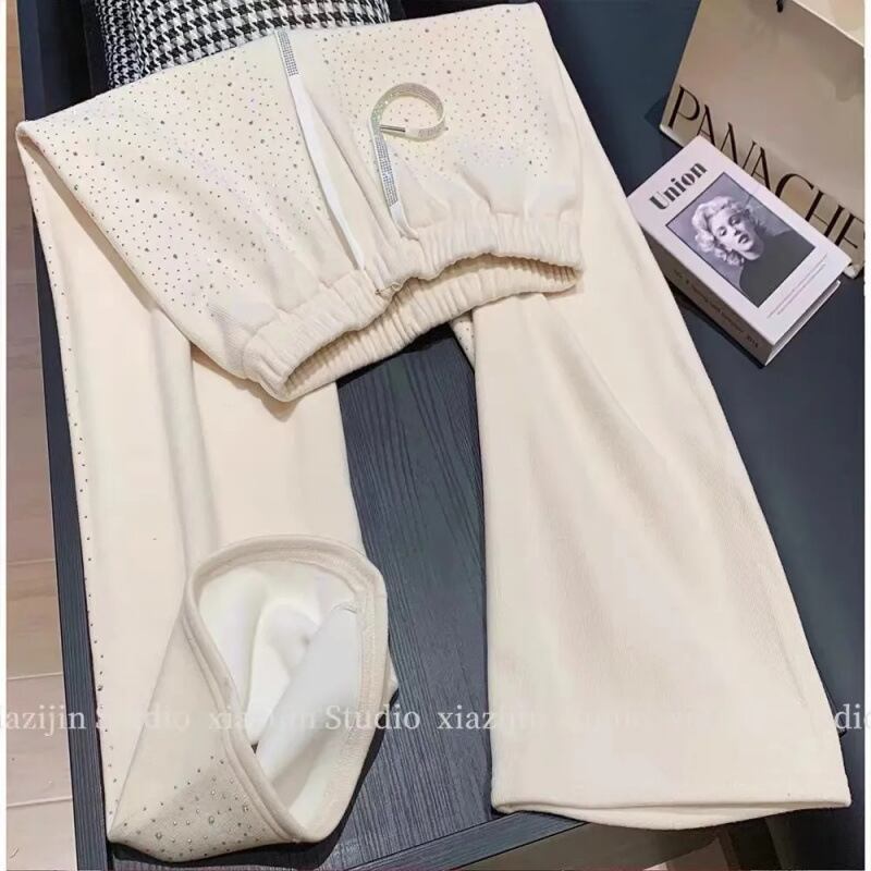 アイボリー 裏起毛 ワイドパンツ レディース 秋冬新作 ラインストーン付き 高見え 厚手ストレート