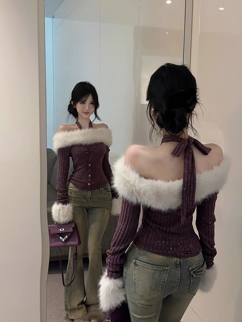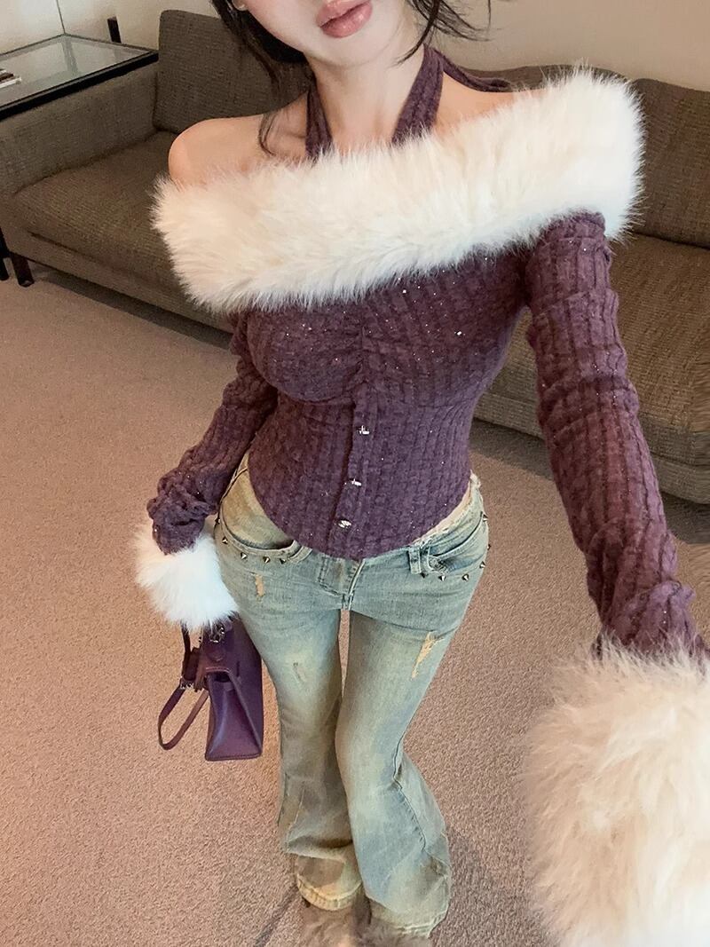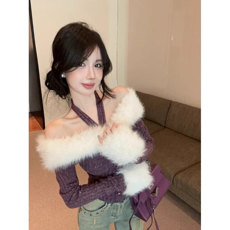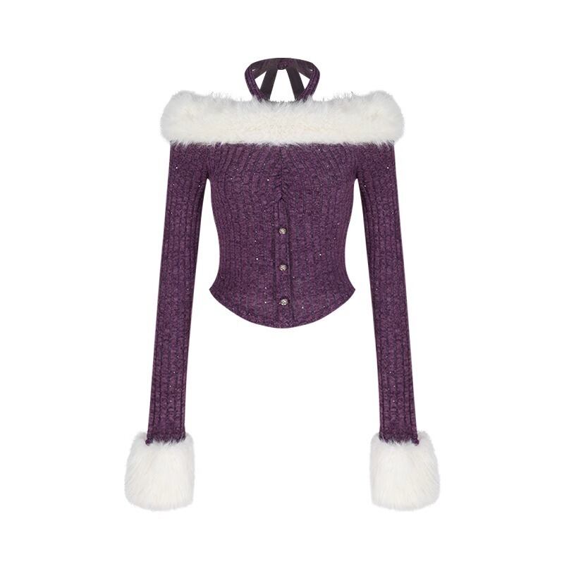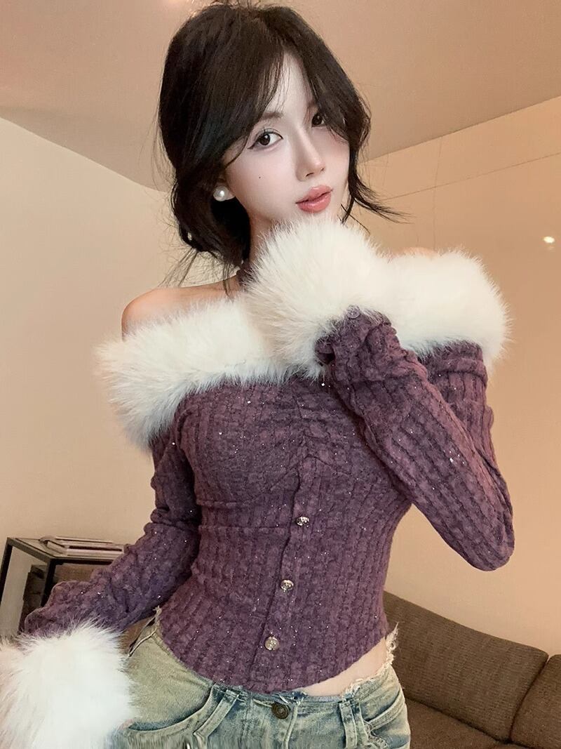 オフショルダー ファー付きトップス レディース 長袖 紫 パーティー 冬新作 セクシー クリスマス