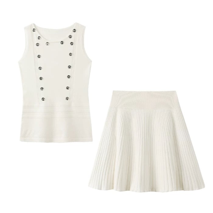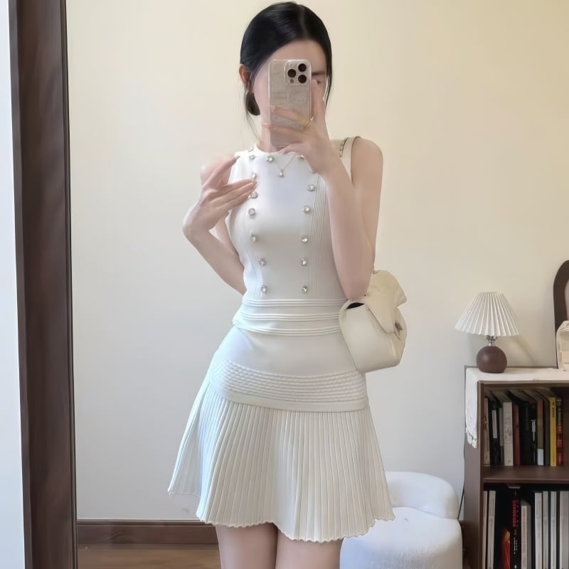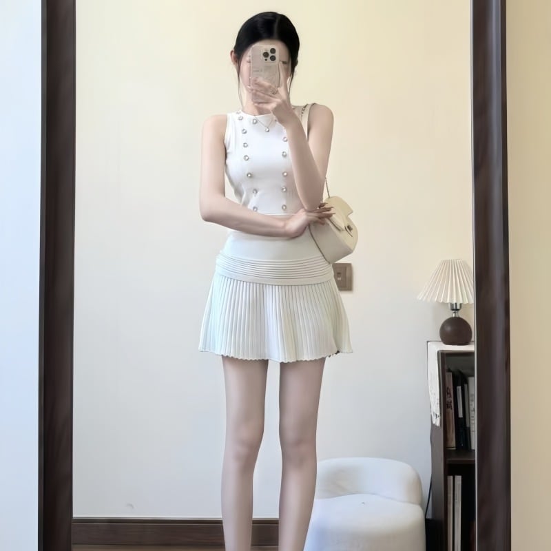 【秋冬レトロガーリー】ノースリーブニットベスト+プリーツスカート セットアップ コート・カーディガンのインナー使いにぴったり