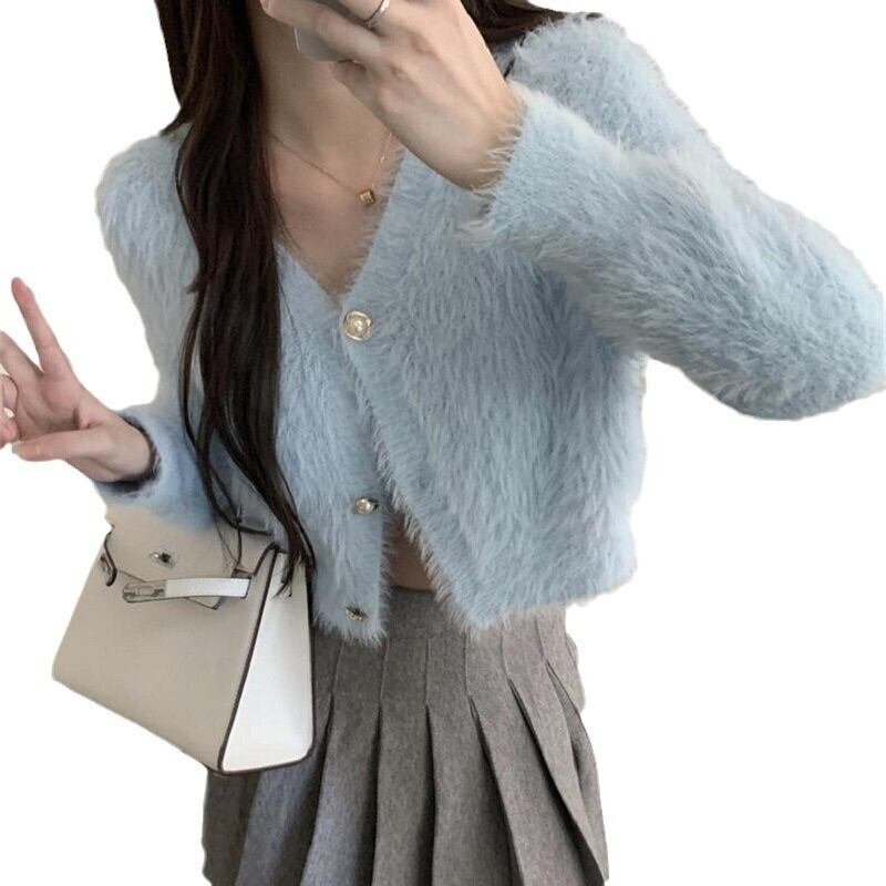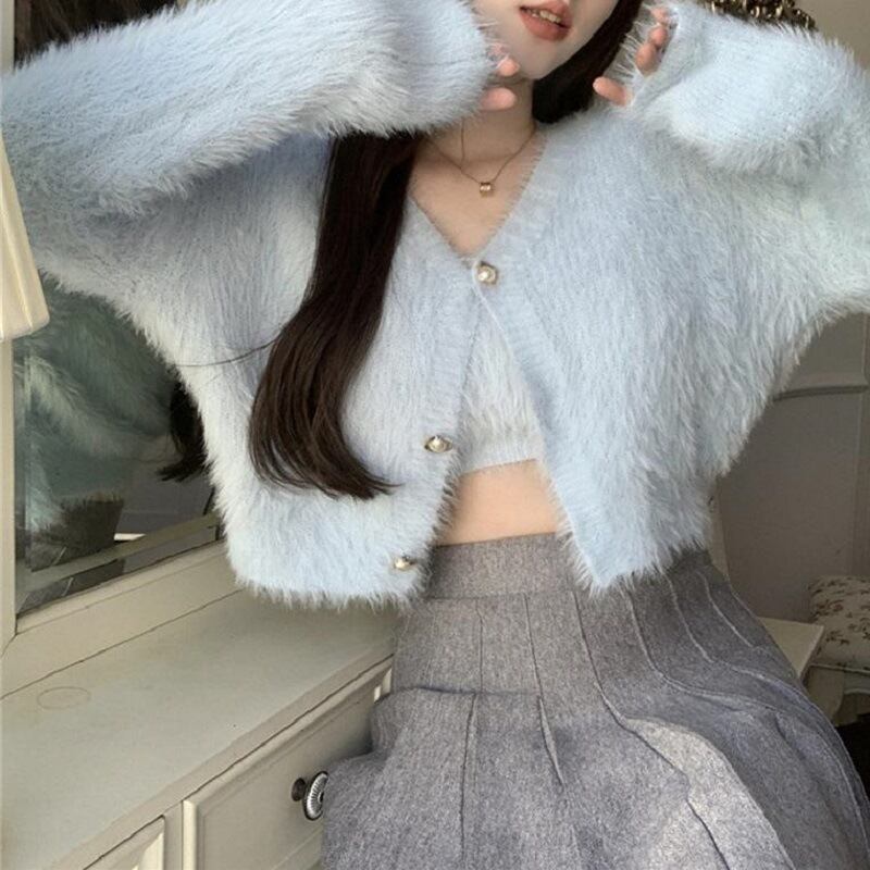 ふんわり柔らかな肌ざわりのショート丈ニットカーディガンと、同素材のキャミソールがセットになった2点セット。