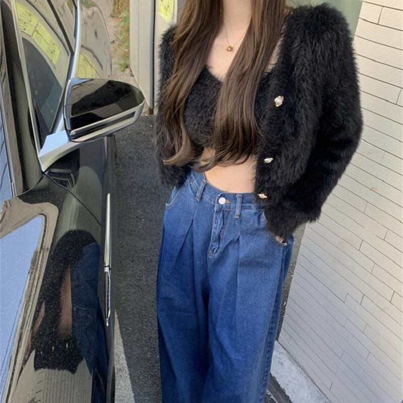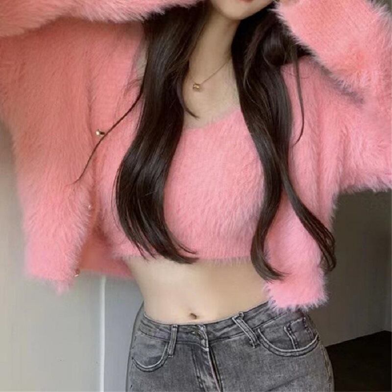 秋冬新作 Vネック ニットカーディガン&キャミソール 2点セット レディース ショート丈 韓国ガーリー ピンク