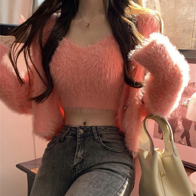 ふんわり柔らかな肌ざわりのショート丈ニットカーディガンと、同素材のキャミソールがセットになった2点セット。