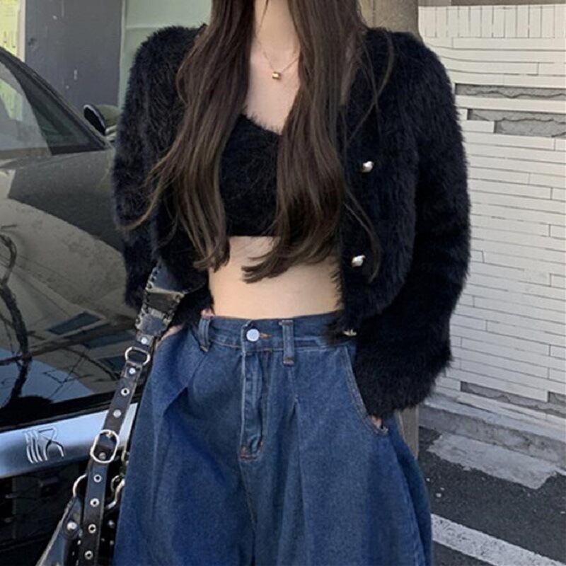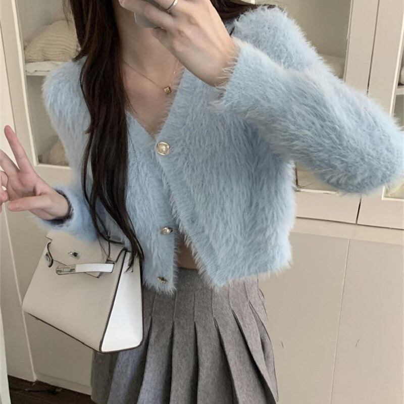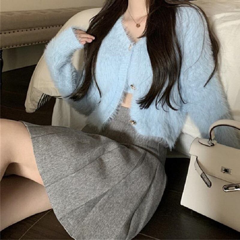 秋冬新作 Vネック ニットカーディガン&キャミソール 2点セット レディース ショート丈 韓国ガーリー ブルー