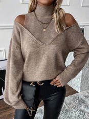 秋冬新作 ニットトップス レディース 肩あき ハイネック リブ 長袖 ゆったり 大人カジュアル 韓国風 カーキ