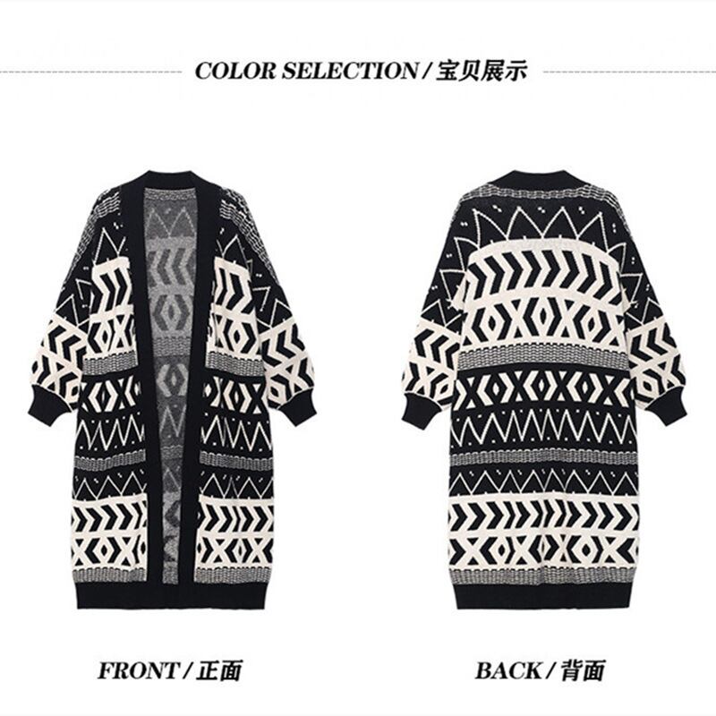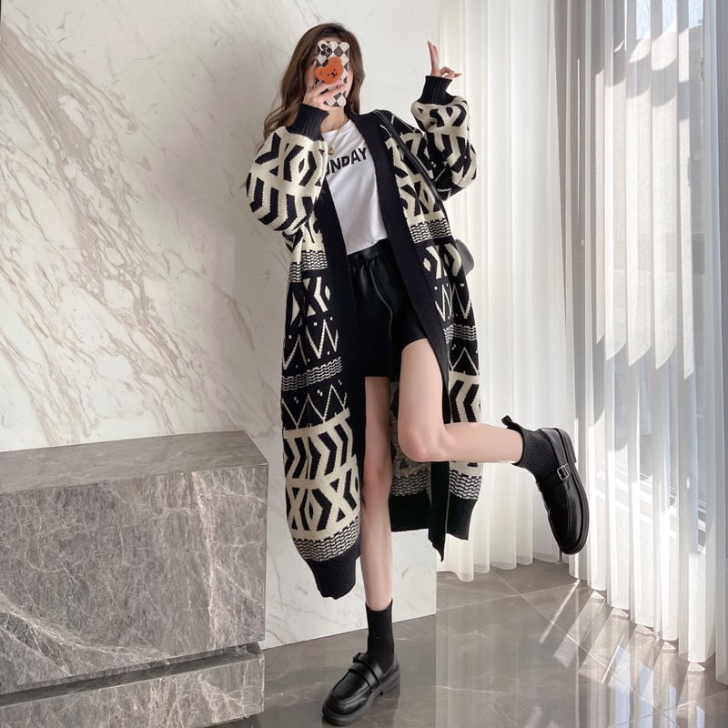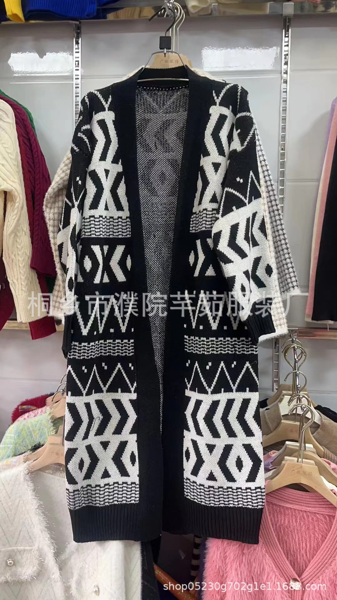 秋冬新作 ロングカーディガン レディース ニット 羽織り 幾何学柄 ゆったり 長袖 韓国風 体型カバー ブラック