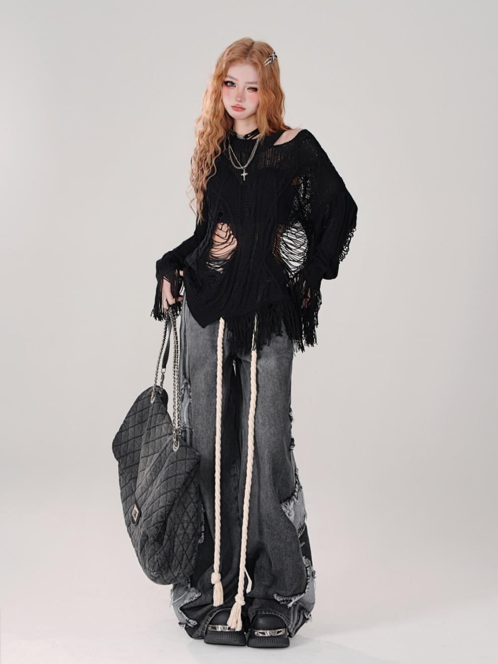 【2025秋新作】Y2K グランジ 透かし編み ニットトップス レディース 薄手 長袖 ゆったり 体型カバー 秋コーデ 大人カジュアル