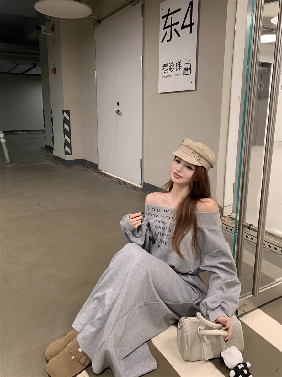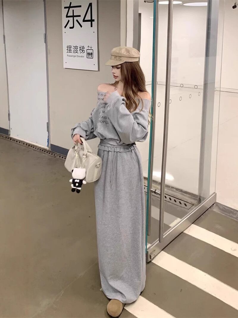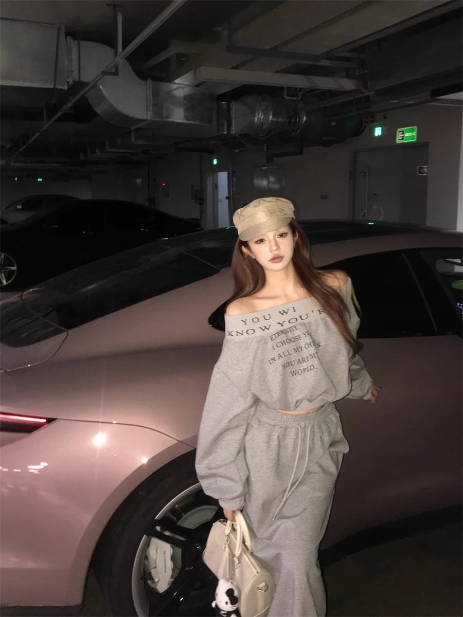 【2025秋新作】オフショルダー スウェット&スカート セットアップ レディース Y2Kギャル 英字プリント 高見え2点セット グレー