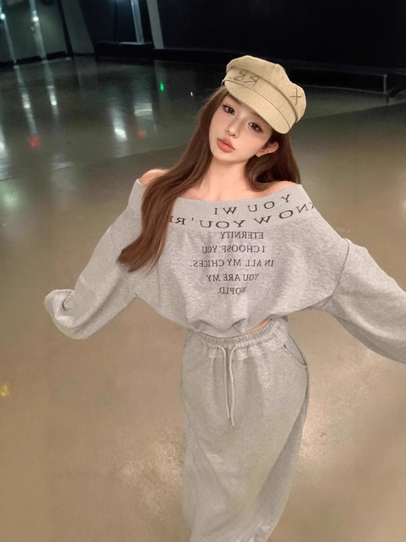 オフショルダーの英字プリントスウェットと、ハイウエストスカートの2点セット。1着で秋の“Y2Kギャルコーデ”が完成する万能アイテムです。