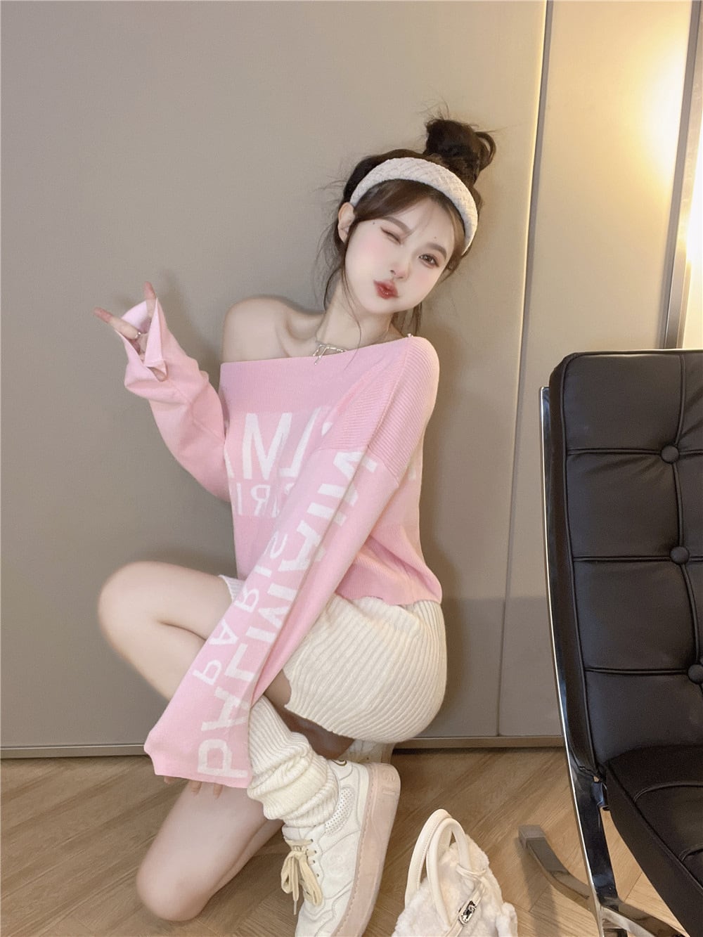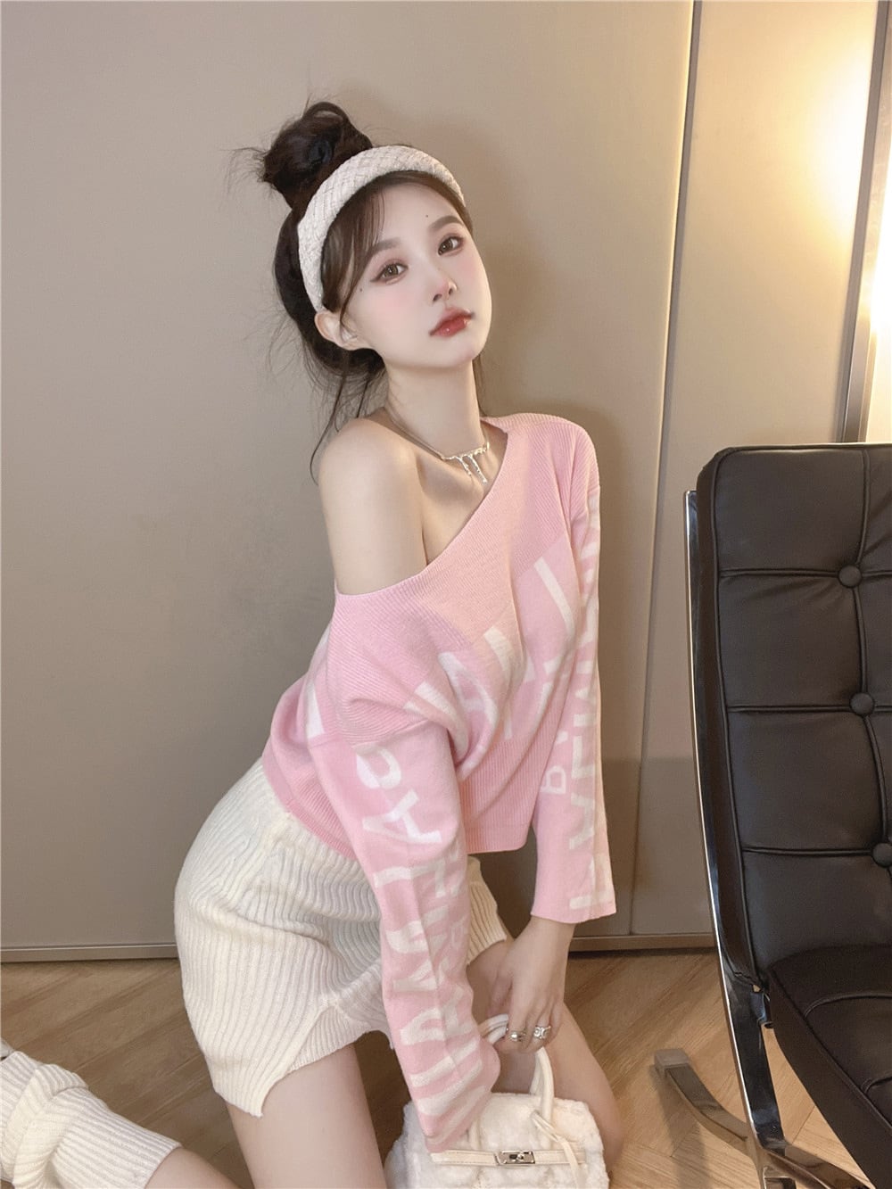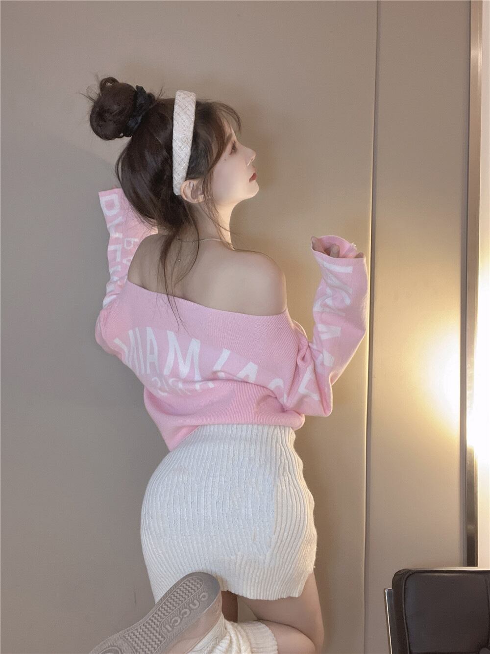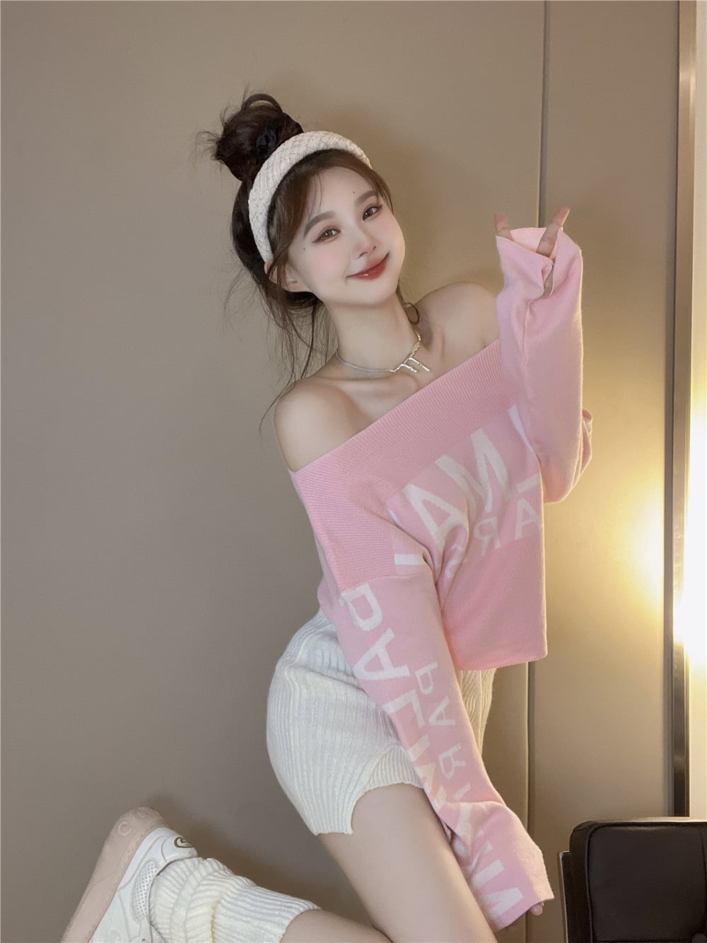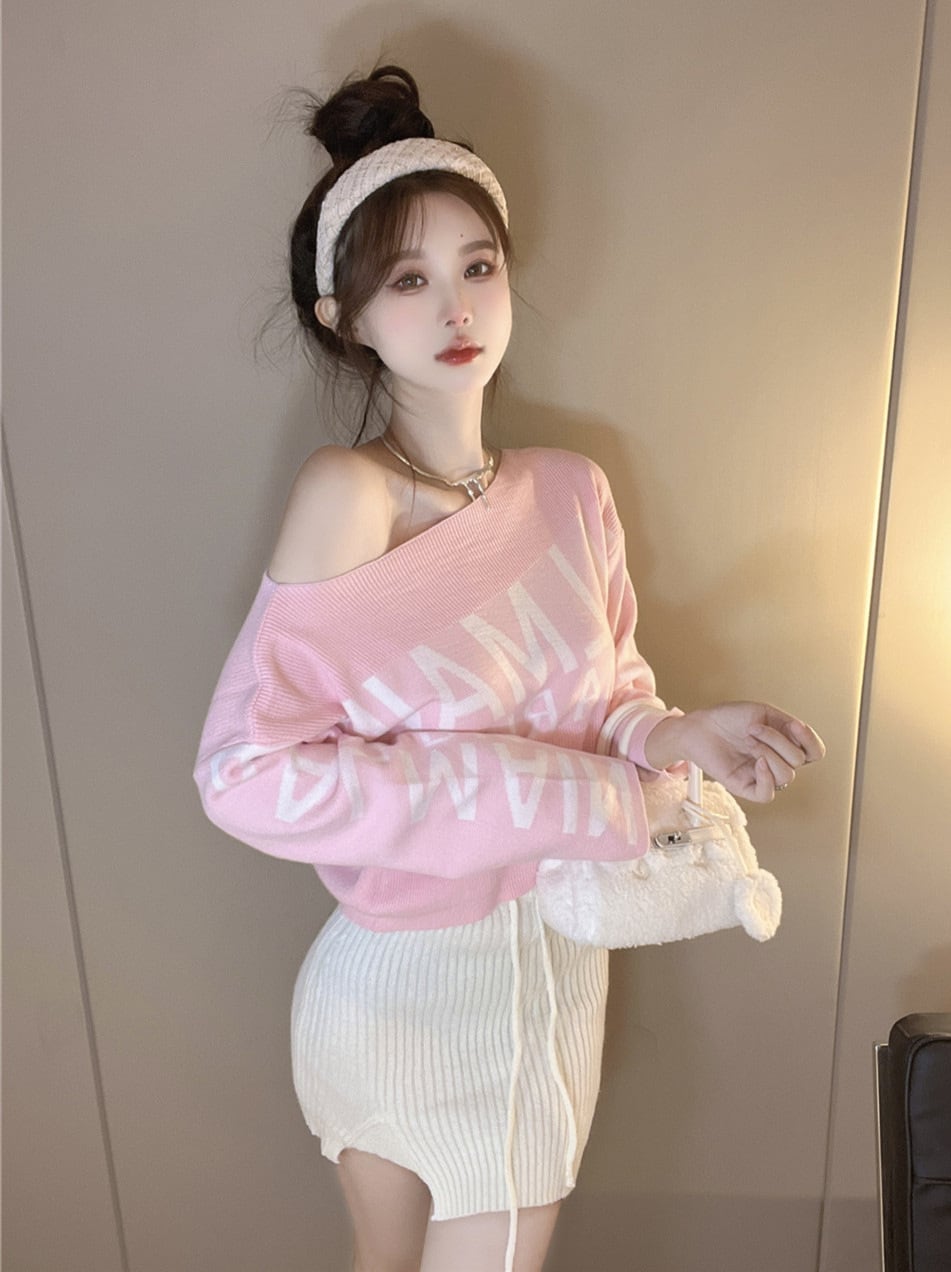 Y2K ギャル ワンピース風 ニット 長袖 秋冬 オフショルダー タイト セクシー ルーズフィット レディース ピンク