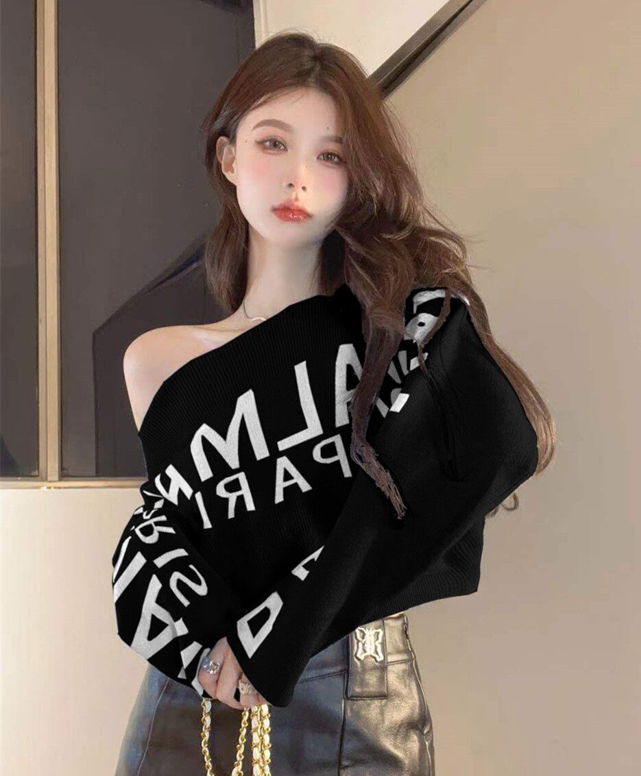 Y2K ギャル ワンピース風 ニット 長袖 秋冬 オフショルダー タイト セクシー ルーズフィット レディース ブラック