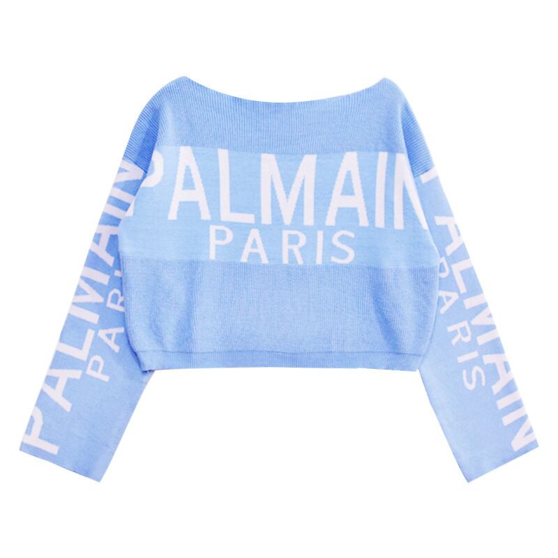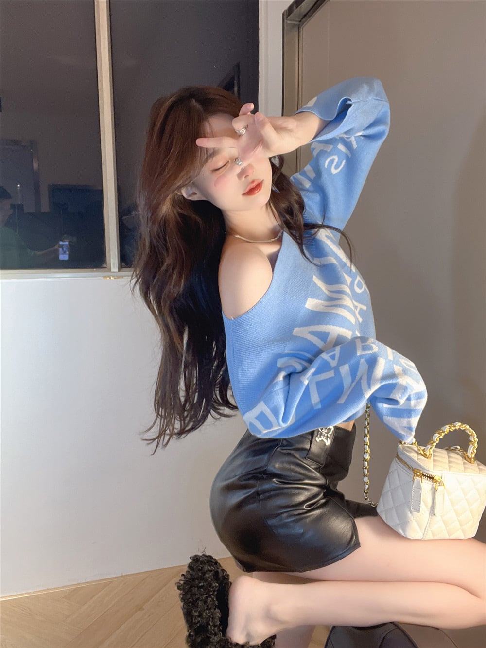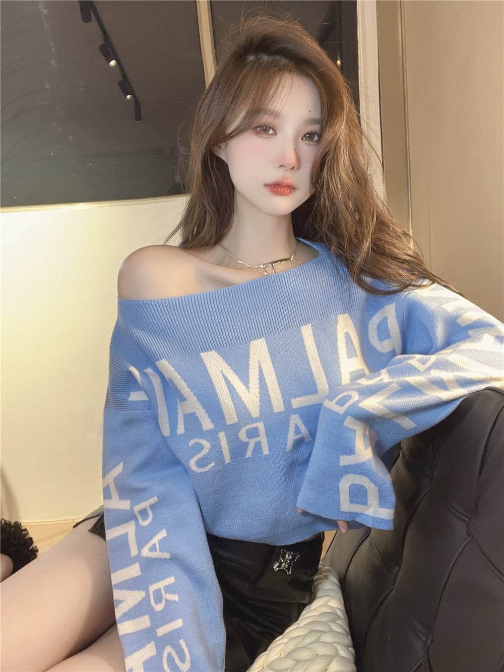 Y2K ギャル ワンピース風 ニット 長袖 秋冬 オフショルダー タイト セクシー ルーズフィット レディース ブルー