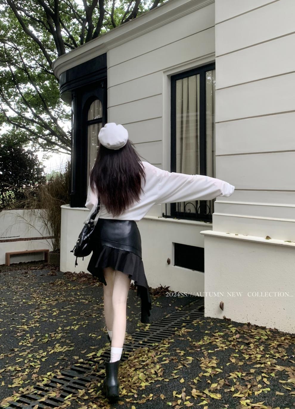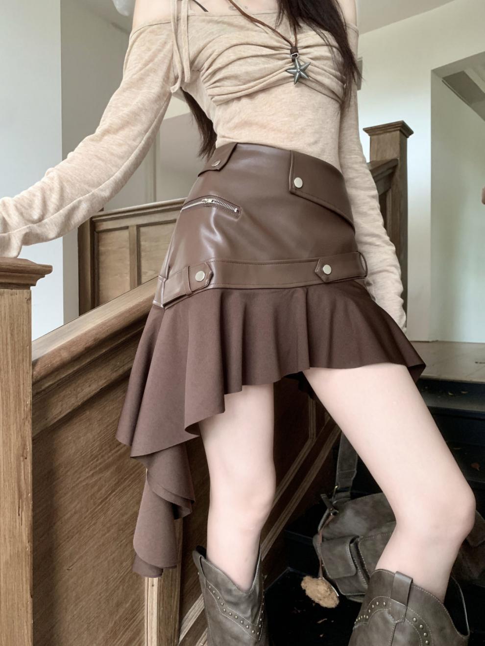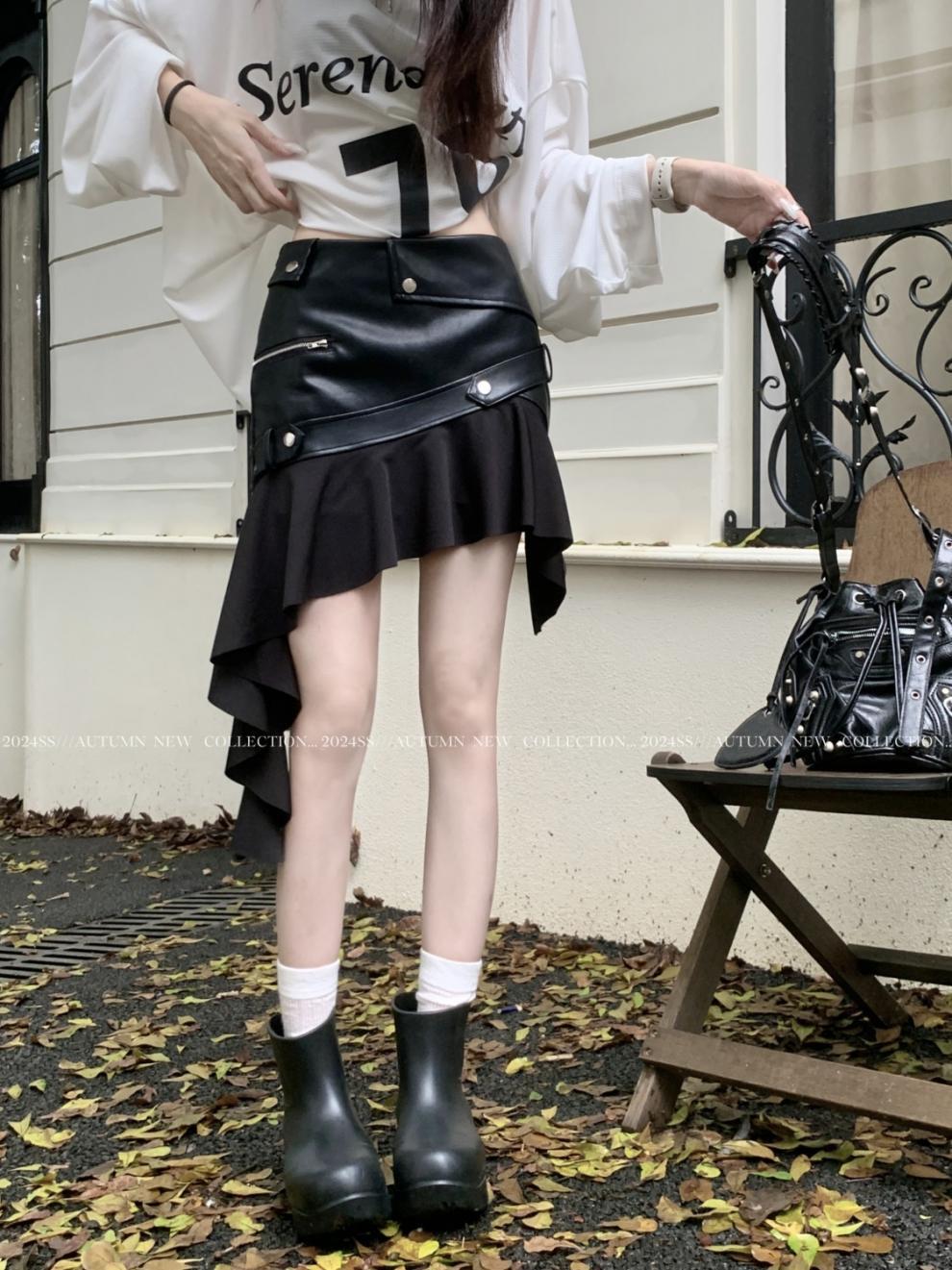 PUレザー スカート レディース 秋冬 Aライン 不規則デザイン フリル裾 ハイウエスト ミニスカート 着痩せ効果 通勤 デート カジュアル ブラック S-XL