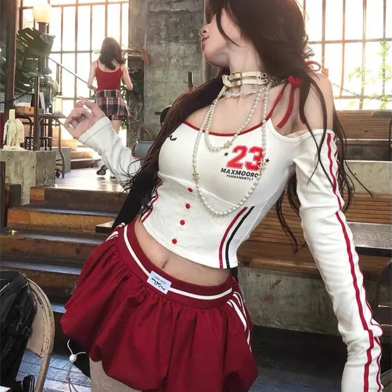 肩あきデザインとクロップド丈でヘルシーな肌見せが叶う長袖トップス。レースやプリントのディテールで、可愛さの中にちょっぴりセクシーさをプラス。ふんわりとボリュームのあるミニスカを合わせてY2K甘辛コーデの完成!