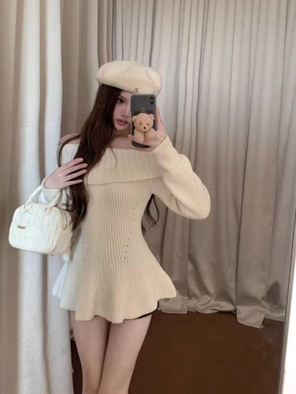 秋新作 ワンショル風ニットワンピ|純欲ガーリー 長袖ミニ丈ワンピース|アイボリー
