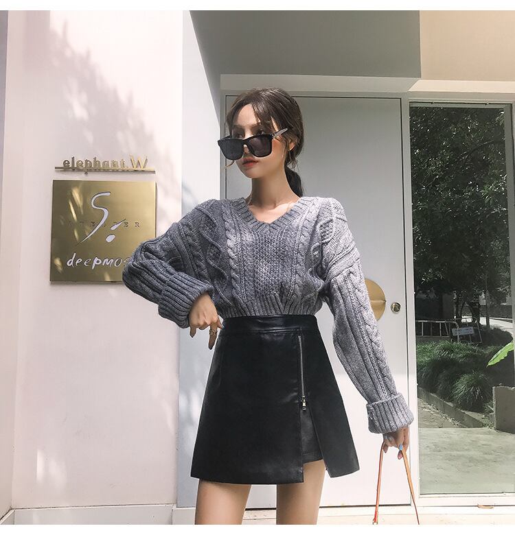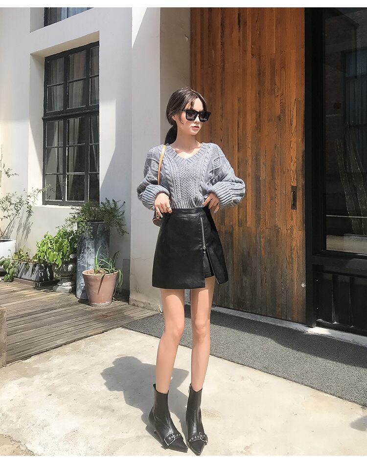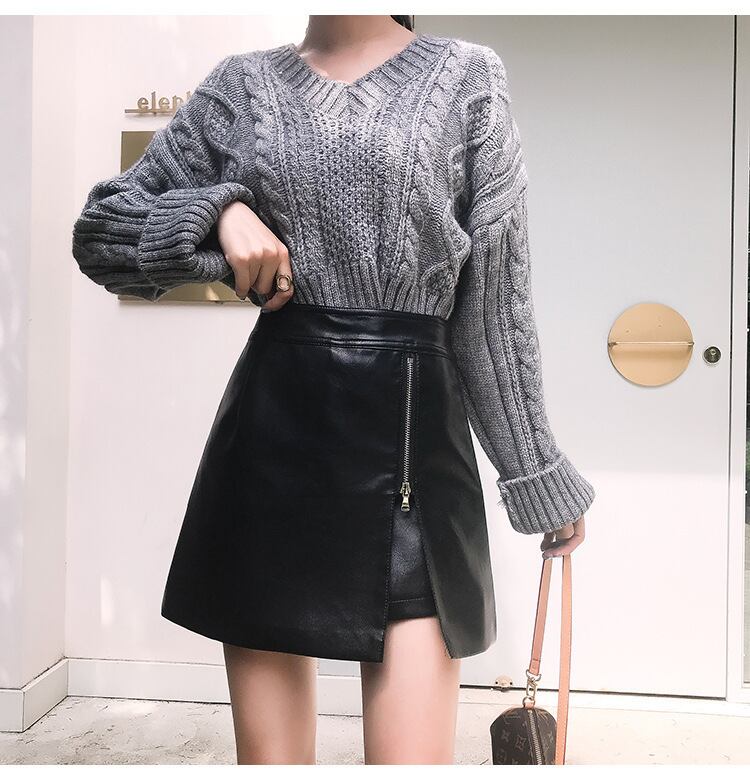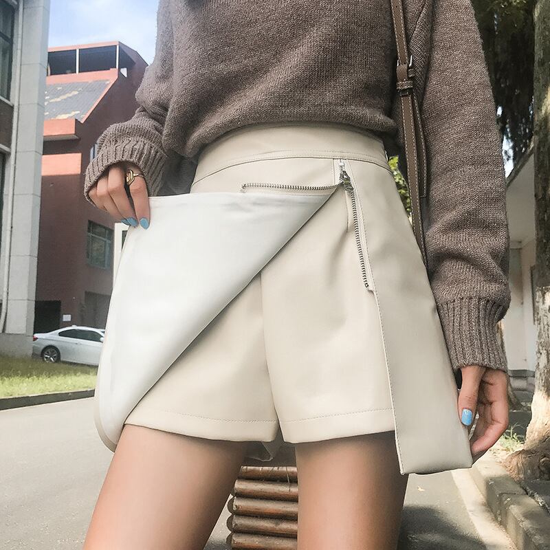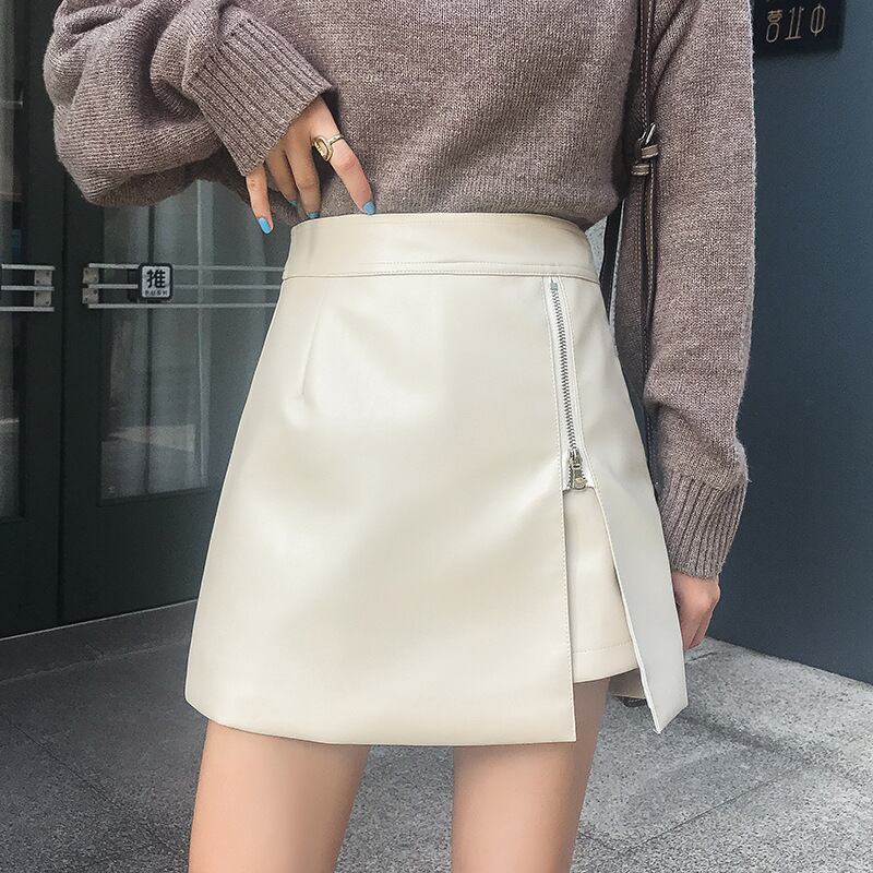 秋冬新作 フェイクレザー ミニスカート|ハイウエスト Aラインスカート|アイボリー XS-2XL