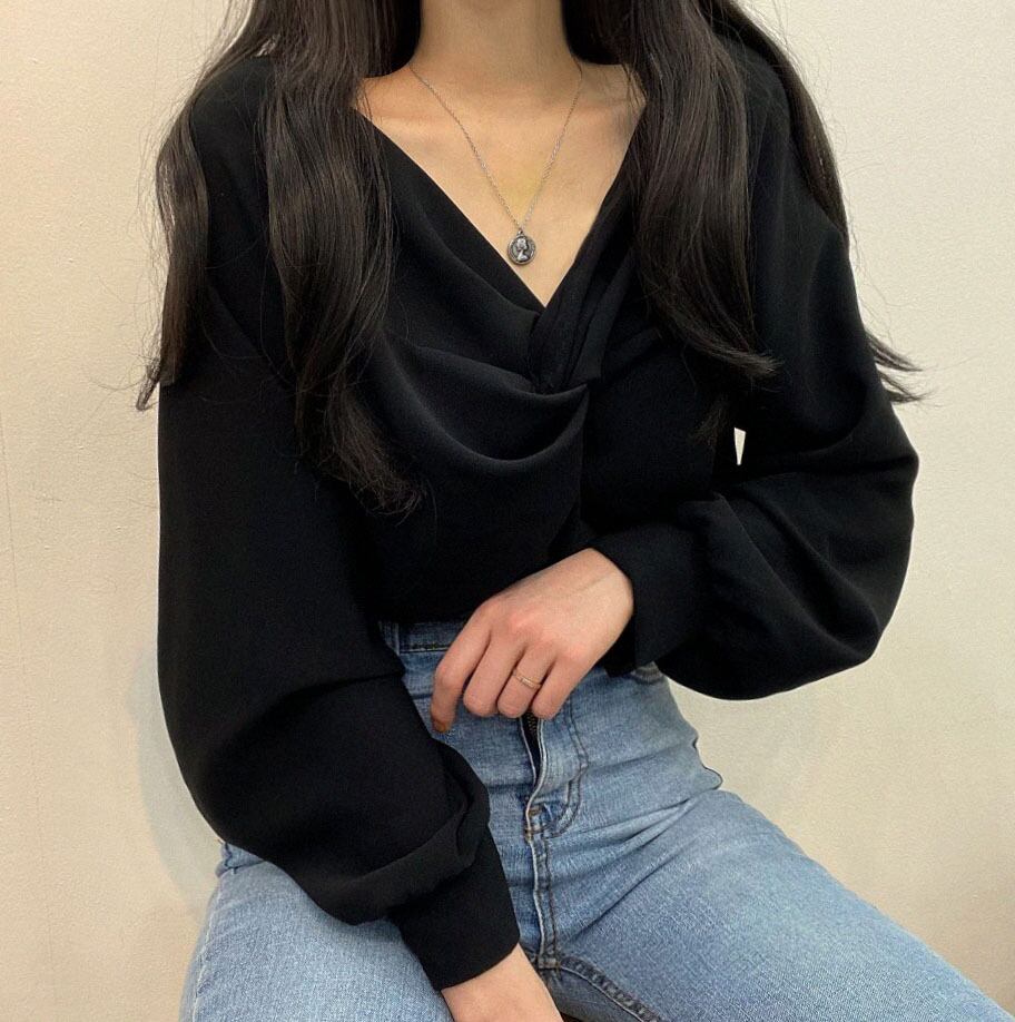 秋新作 フレンチシック シャーリングシャツ|ツイストデザイン 長袖ブラウス|M-2XL ブラック