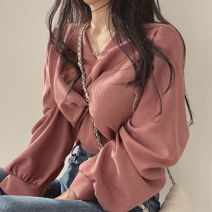 秋新作 フレンチシック シャーリングシャツ|ツイストデザイン 長袖ブラウス|M-2XL ダークピンク
