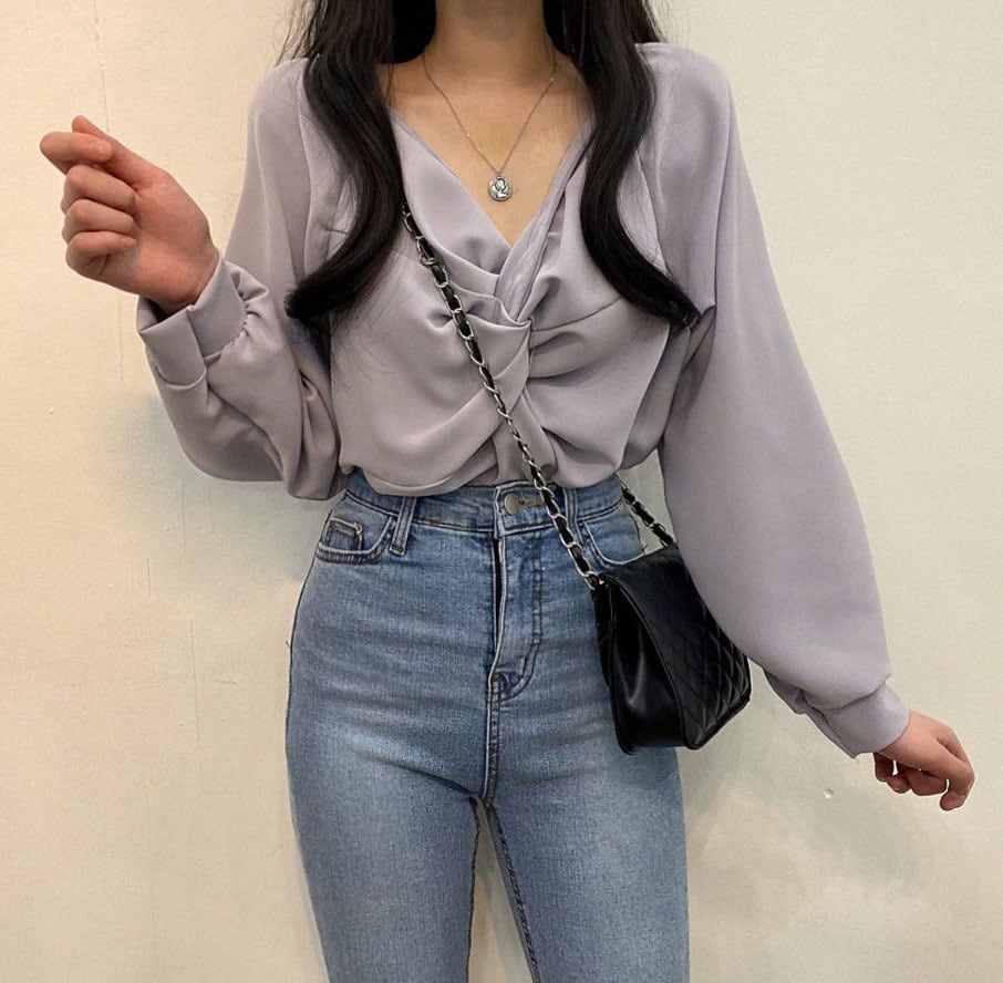 秋新作 フレンチシック シャーリングシャツ|ツイストデザイン 長袖ブラウス|M-2XL ブルー