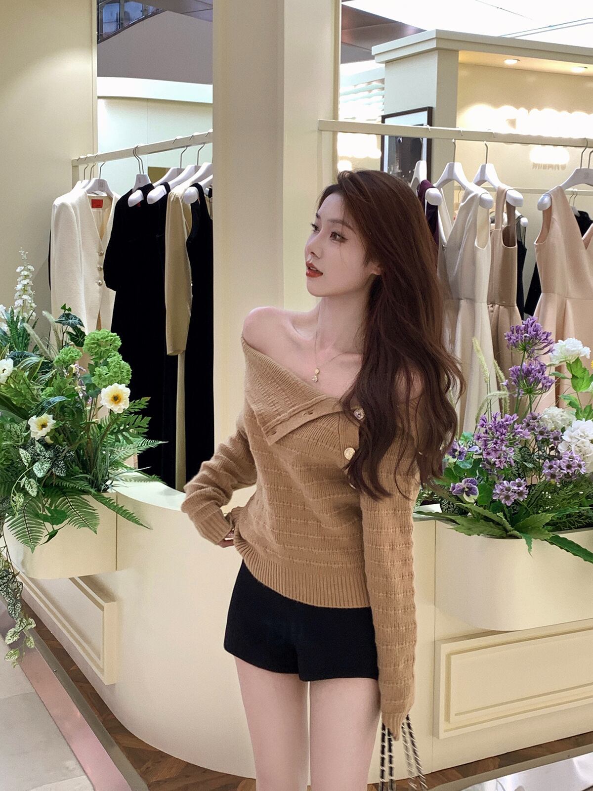 【あざと可愛い肩見せニット】 オフショルダー 長袖 タイトトップス 秋冬新作 小柄女子にも◎ ブラウン
