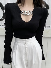大胆なVネックにチェーンをあしらった、大人ギャルにぴったりのセクシーニットトップス。