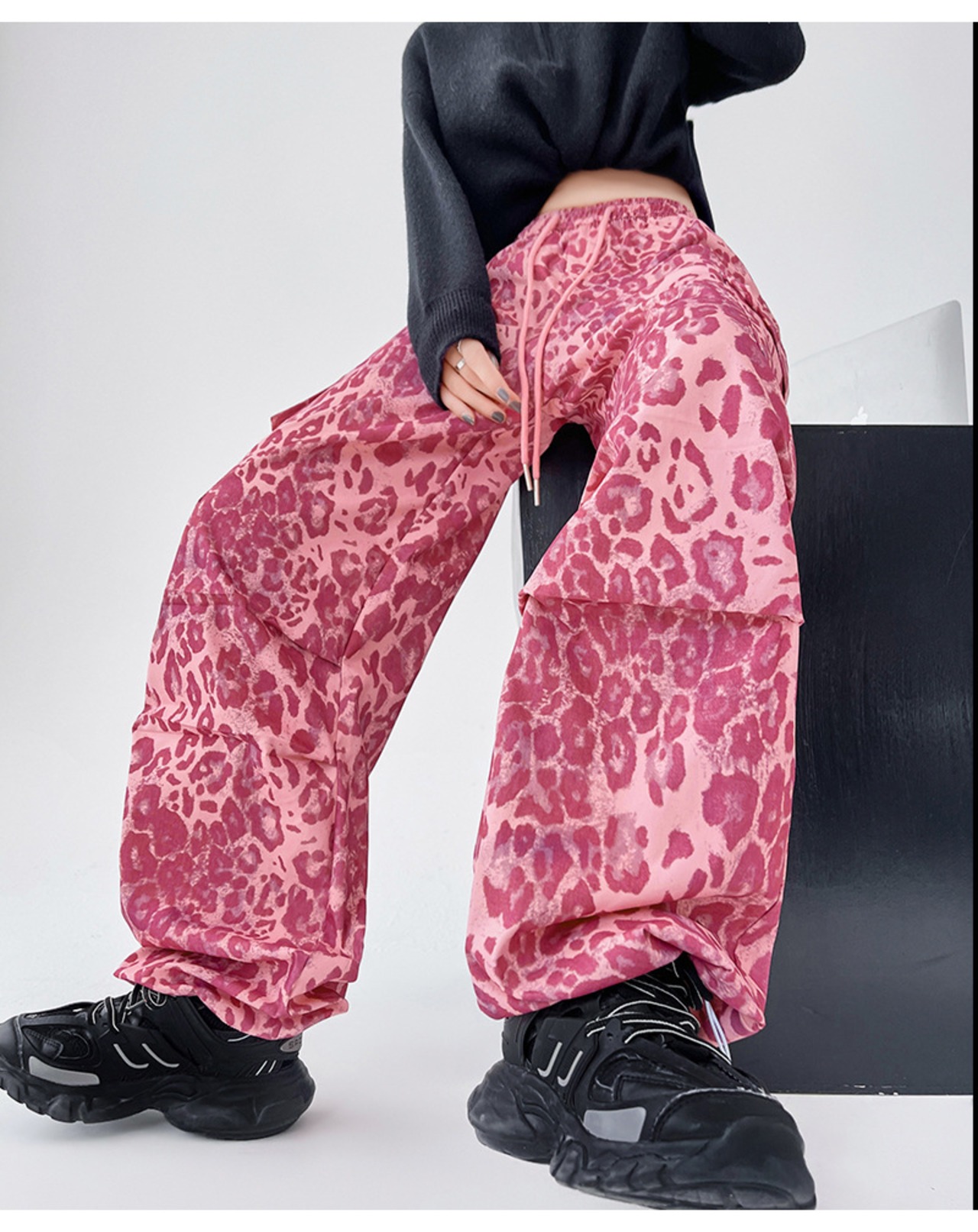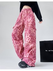 レオパード柄 ストリートワイドパンツ レディース ハイウェストロング丈 ストレートパンツ ピンク
