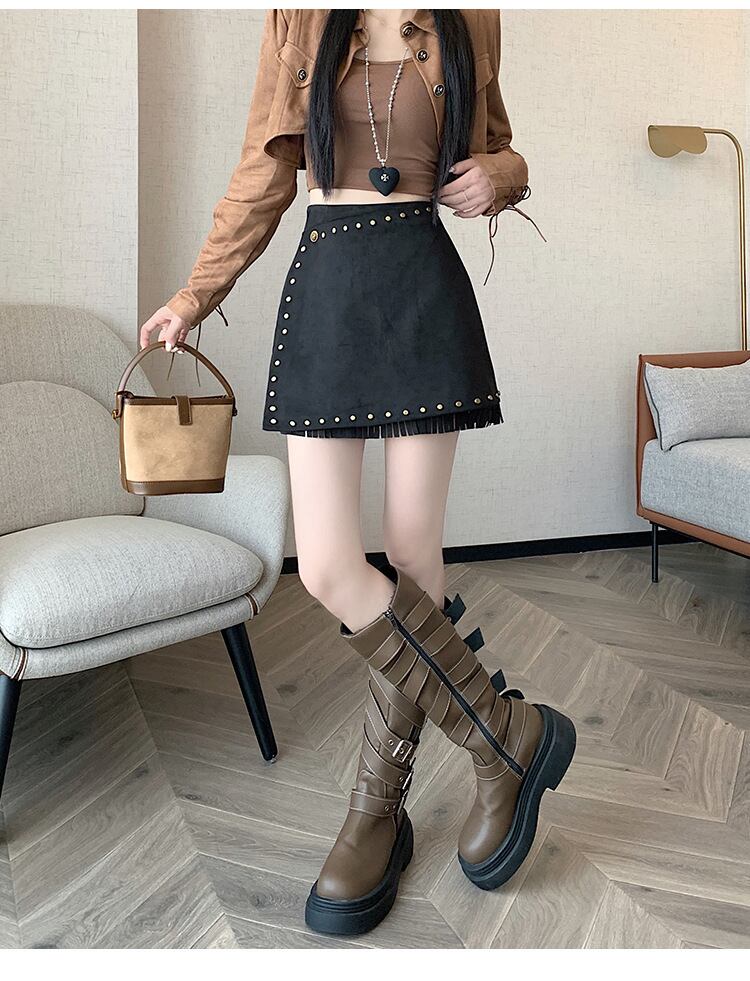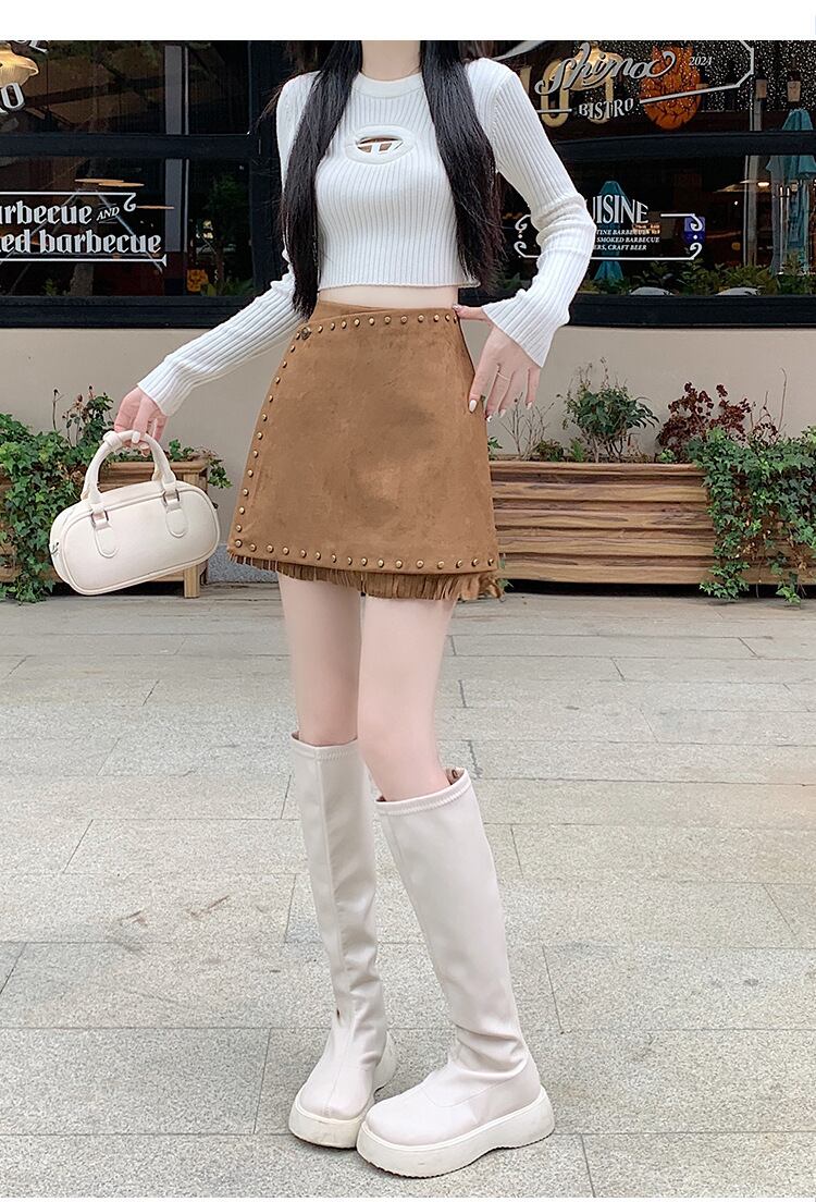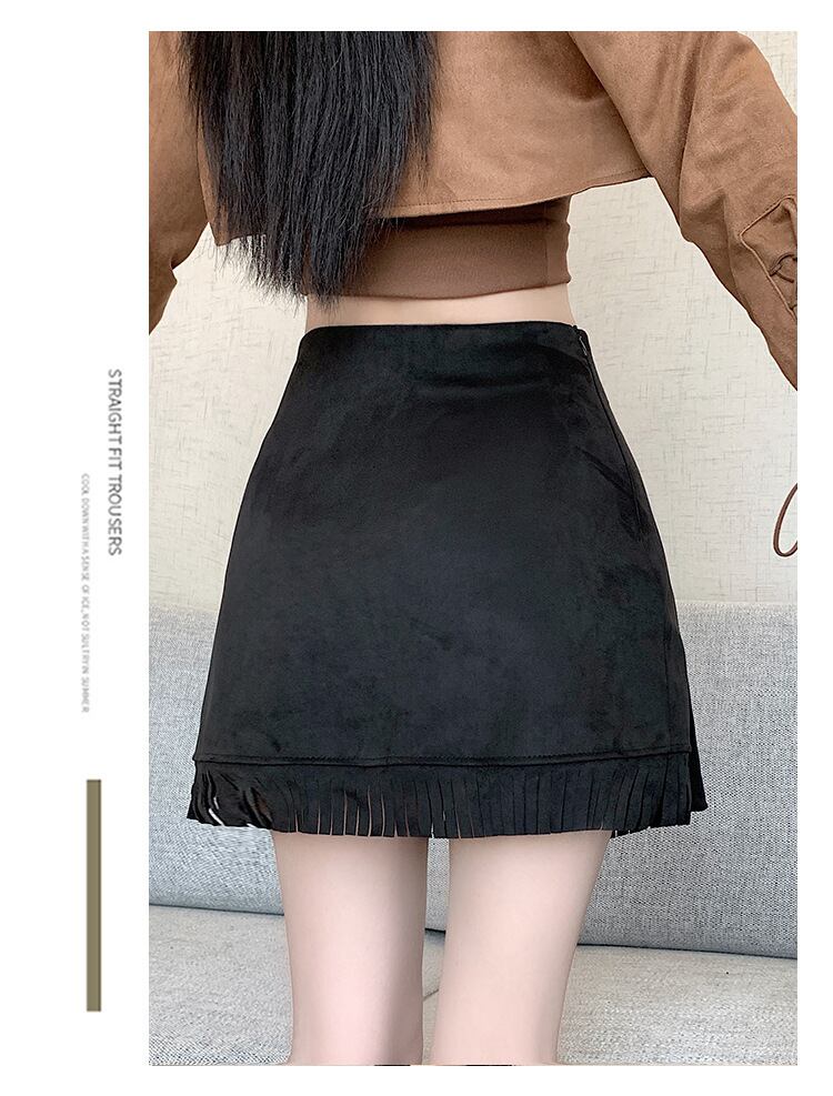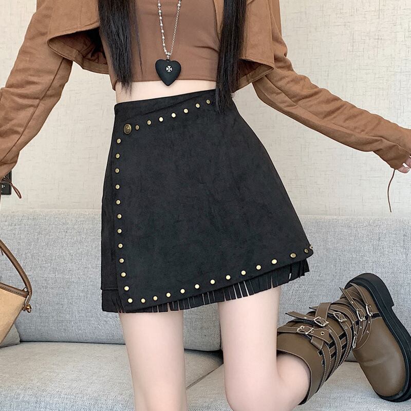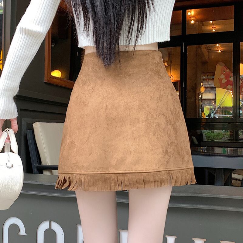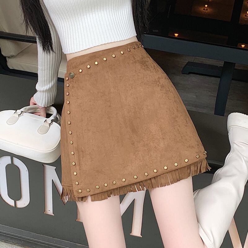 2025秋冬新作 スエード調 タイトスカート|スタッズ×フリンジ デザイン Aラインミニスカート S-XL カーキ