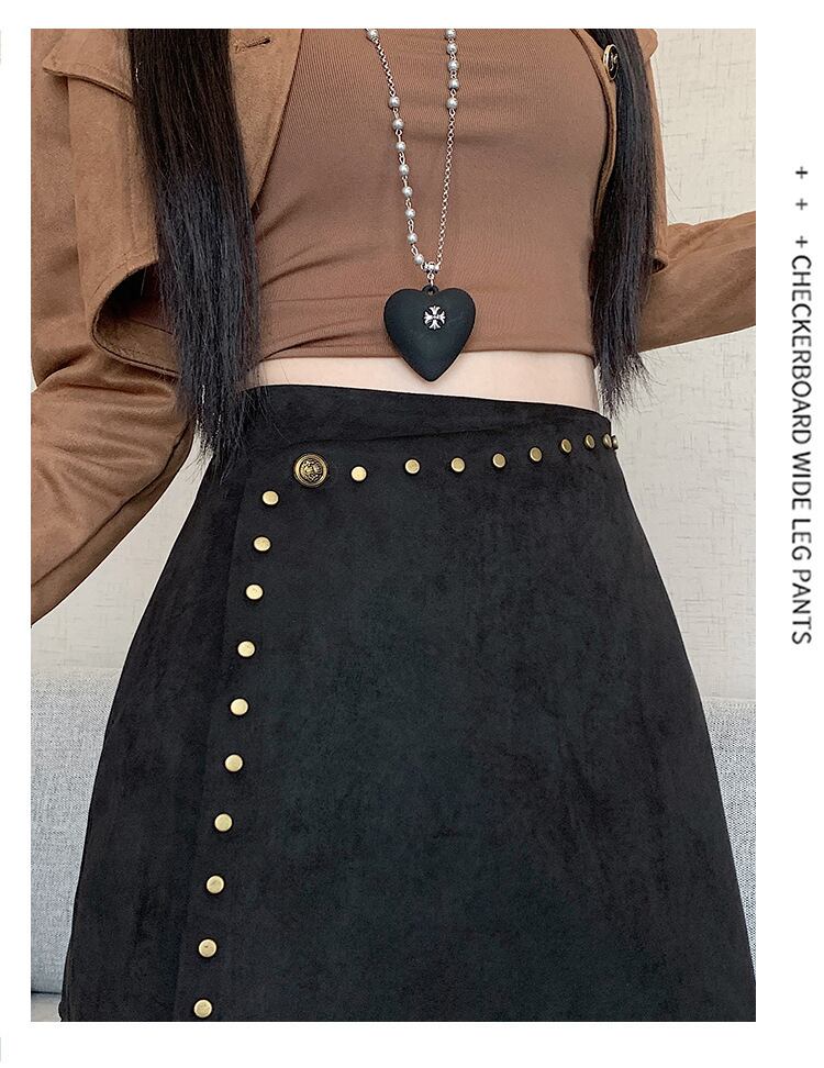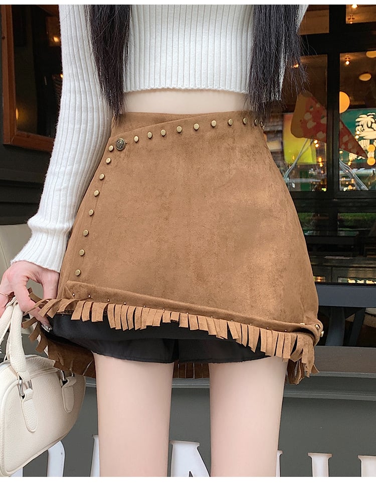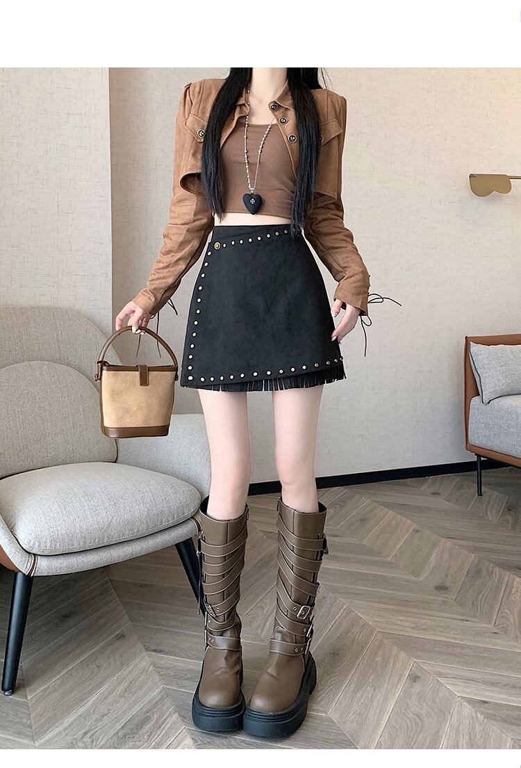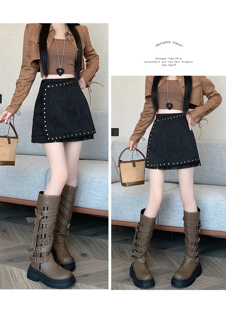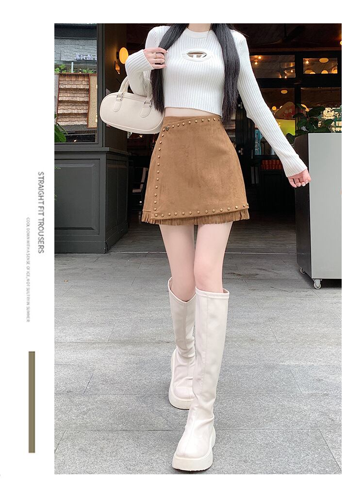 2025秋冬新作 スエード調 タイトスカート|スタッズ×フリンジ デザイン Aラインミニスカート S-XL カーキ